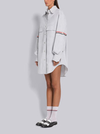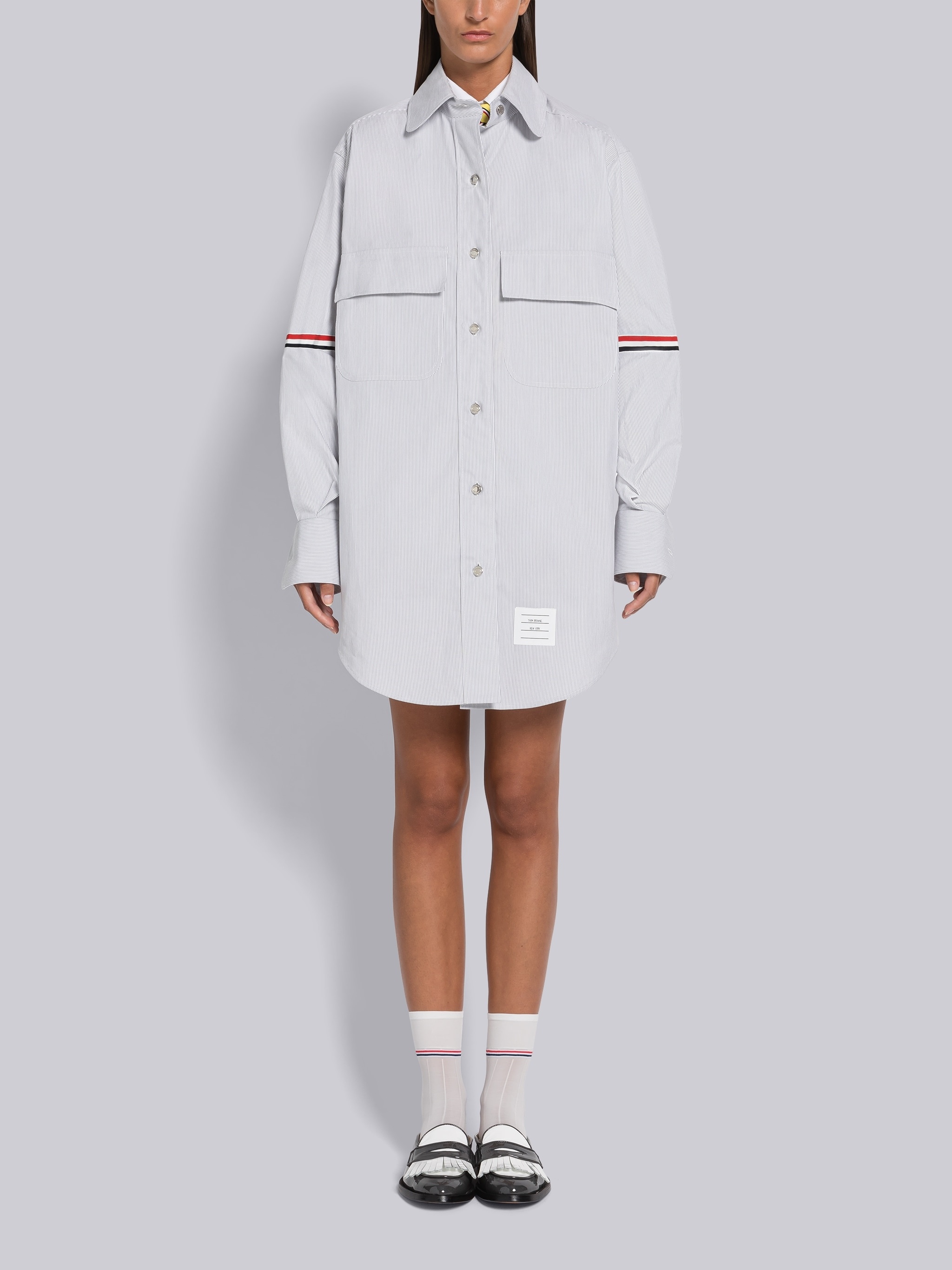 DETAILS & FIT Supersized mini shirtdress in grey and white pincord with striped grosgrain armbands. Snap button closure, rounded point collar, 2 large flap chest pockets, name tag applique above rounded hem. Pleated buttoned cuffs. Pleated back yoke with locker loop. Signature striped grosgrain loop tab at back of neck. Made in Italy 100% Cotton FDSE09O06272035