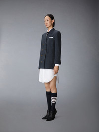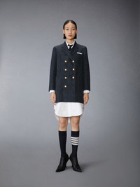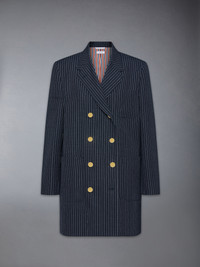 Made to be worn as a dress or an oversized jacket, this elegant blazer features gold buttons embossed with an all-new Thom Browne insignia. Time-honored pinstripes—markers of affiliation and professionalism—make this piece versatile enough to seamlessly transition from the office to a night on the town and beyond. Double-breasted front button closure 3 Front patch pockets Buttoned cuffs with signature striped grosgrain trim Signature striped grosgrain loop tab Model is 5'10" (178 cm), wearing size 40 97% Virgin Wool, 3% Polyester Lining: 100% Silk Made in Italy FDSF32A-F0932-415