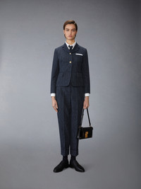 Classic Thom Browne trousers inspired by 19th-century work uniforms, featuring all-new gold buttons embossed with the Thom Browne insignia. Dress them down with a classic poplin shirt, or complete the suit with our Pinstripe High Twist Wool Sport Coat. Tab front closure Button-fastening back welt pockets Adjustable buttoned backstrap Signature striped grosgrain loop tab Fit 1 Model is 5'10" (178 cm), wearing size 40 97% Virgin Wool, 3% Polyester Lining: 100% Cupro Made in Italy FTC507A-F0932-415