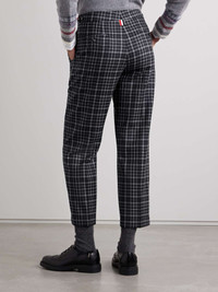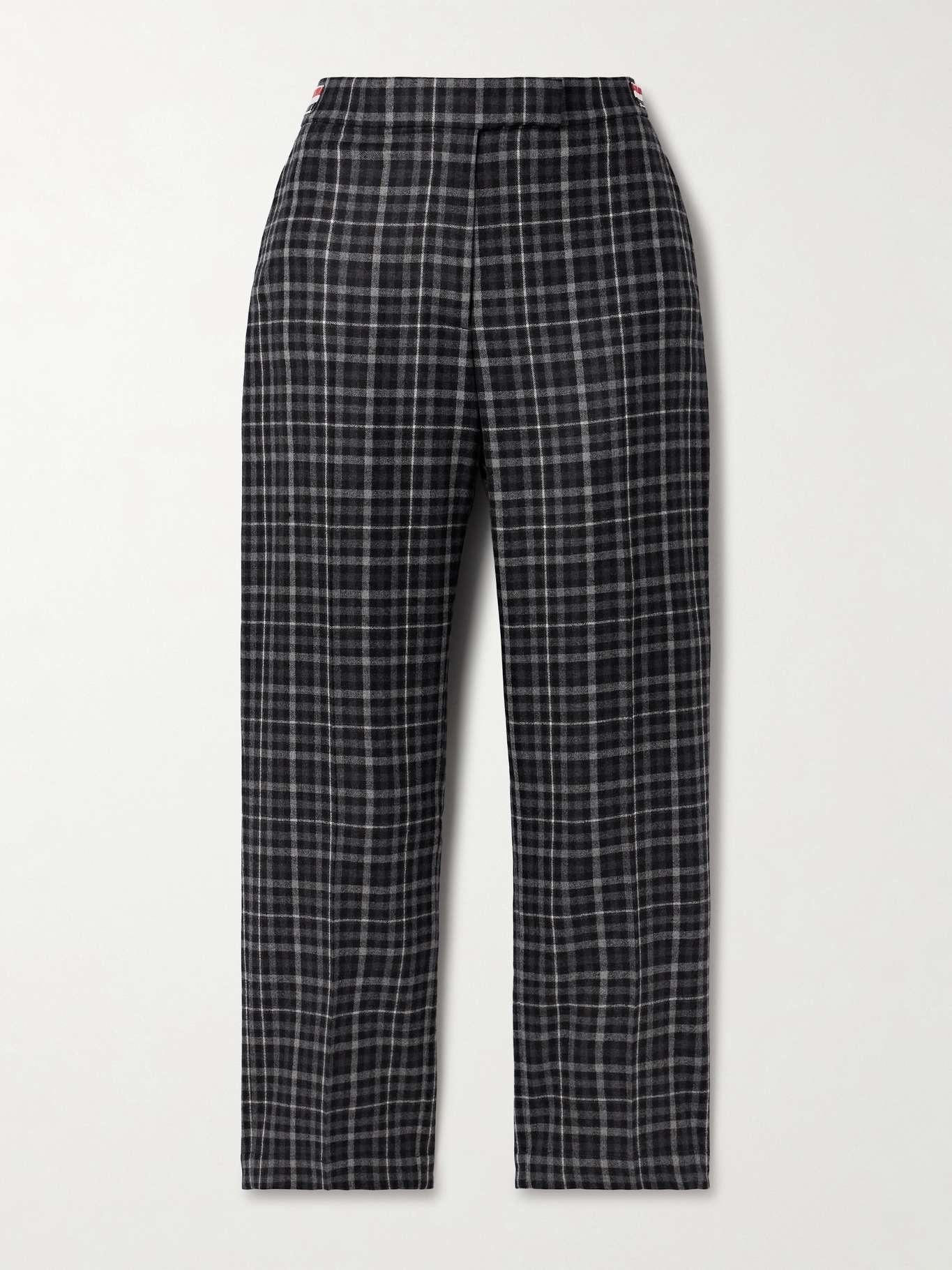 EDITORS'NOTES Thom Browne takes classically preppy style and updates it with a modern twist. These pants are made from wool-flannel in a monochromatic tartan motif and have straight legs traced with pressed creases. The signature tricolored grosgrain tabs at the high waist allow you to adjust the fit. SIZE & FIT Model measurements: - Fits true to size, take your normal size - High-rise, cut for a straight-leg fit - Mid-weight, non-stretchy fabric - Model is 175cm/ 5'9" and is wearing an IT 40 - Bust: 81cm/ 32" - Waist: 65cm/ 26" - Hip: 90cm/ 35" DETAILS & CARE - Black, tonal-gray and white wool-flannel, red, white and black grosgrain - Concealed hooks, button and zip fastening at front - 100% wool - Dry clean