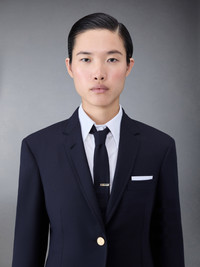 Elongated single button sport coat in navy plain weave suiting with tonal engineered 4-bar stripe detail at left sleeve. Front button closure, notched lapels, 2 flap front pockets, single chest pocket. Buttoned cuffs with signature striped grosgrain trim. Double vented back hem. Striped lining with interior pocket and name tag. Signature striped grosgrain loop tab at back of neck. Model is 5'10" (178 cm), wearing size 40 100% Wool Lining: 100% Cupro Made in Italy FBC862A-06146-420