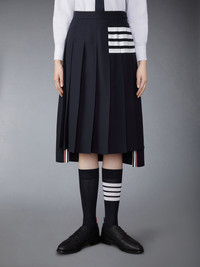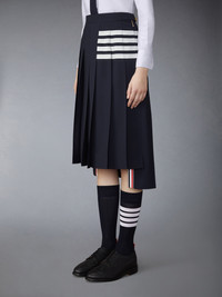Inspired by East Coast preppy icons but reimagined with inventive proportions and quality craftsmanship, our Plain Weave 4-Bar Below Knee Dropped Back Pleated Skirt is a fresh take on a traditional silhouette. Pair with our leather brogue heels. Engineered 4-bar stripe detail Dropped back hem with signature striped grosgrain trim Adjustable Buttoned side tab closure Signature striped grosgrain loop tab at back waist Model is 5' 10" (178cm), wearing size 40 100% Wool Lining: 100% Cupro Made in Italy FGC400V-06146-415