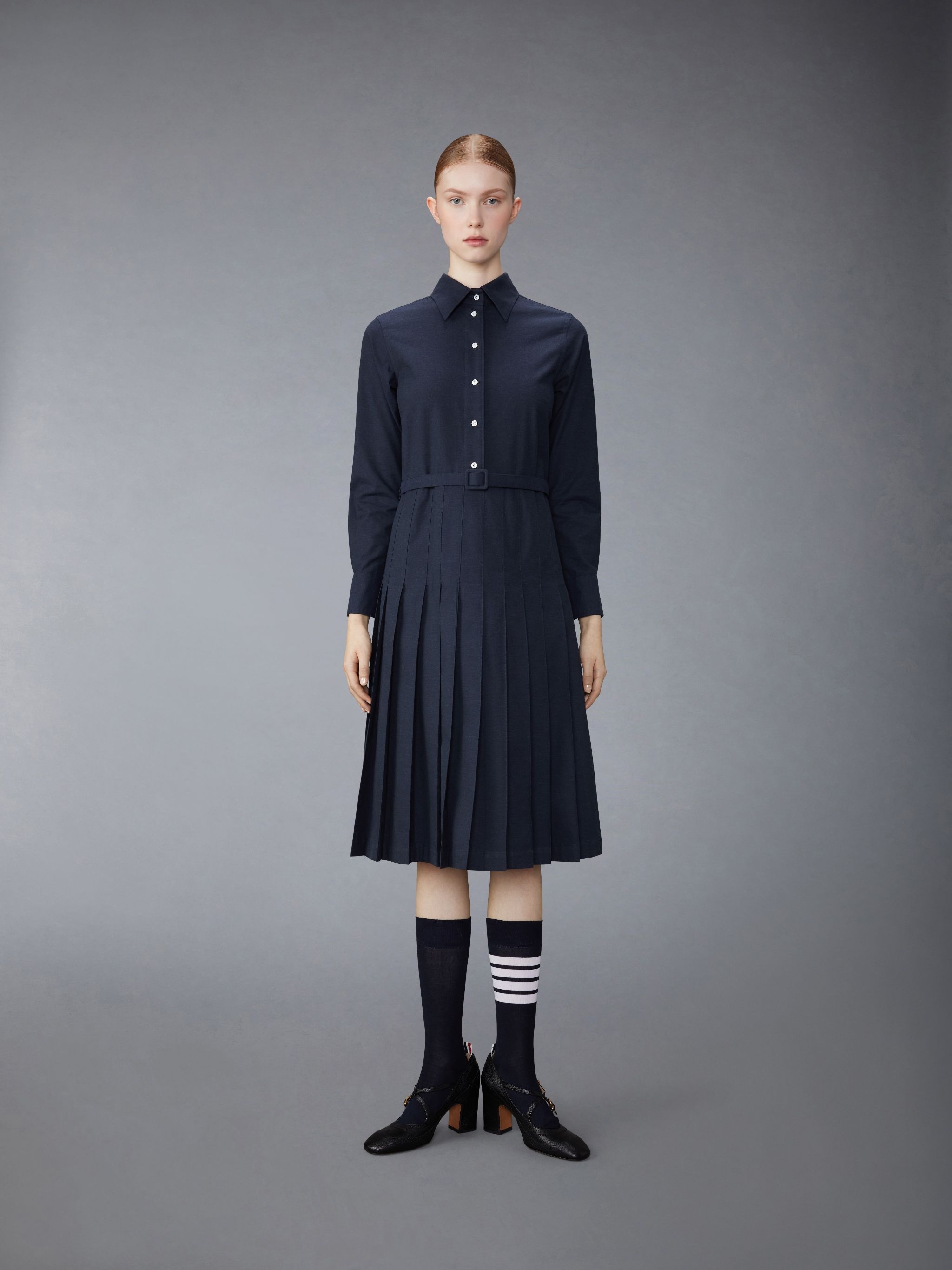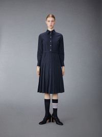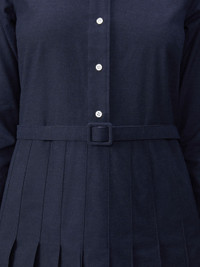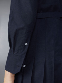 DETAILS & FIT Impeccable craftsmanship, fine fabric, and distinctive Thom Browne emblems make this dress an essential garment for your seasonal wardrobe. Pair it with any of our classic leather brogues. Partial front button closure Belted waist Signature striped grosgrain loop tab Model is 5'10" (178 cm), wearing size 40 100% Cotton Made in ITALY FDSE89A-F0351-415