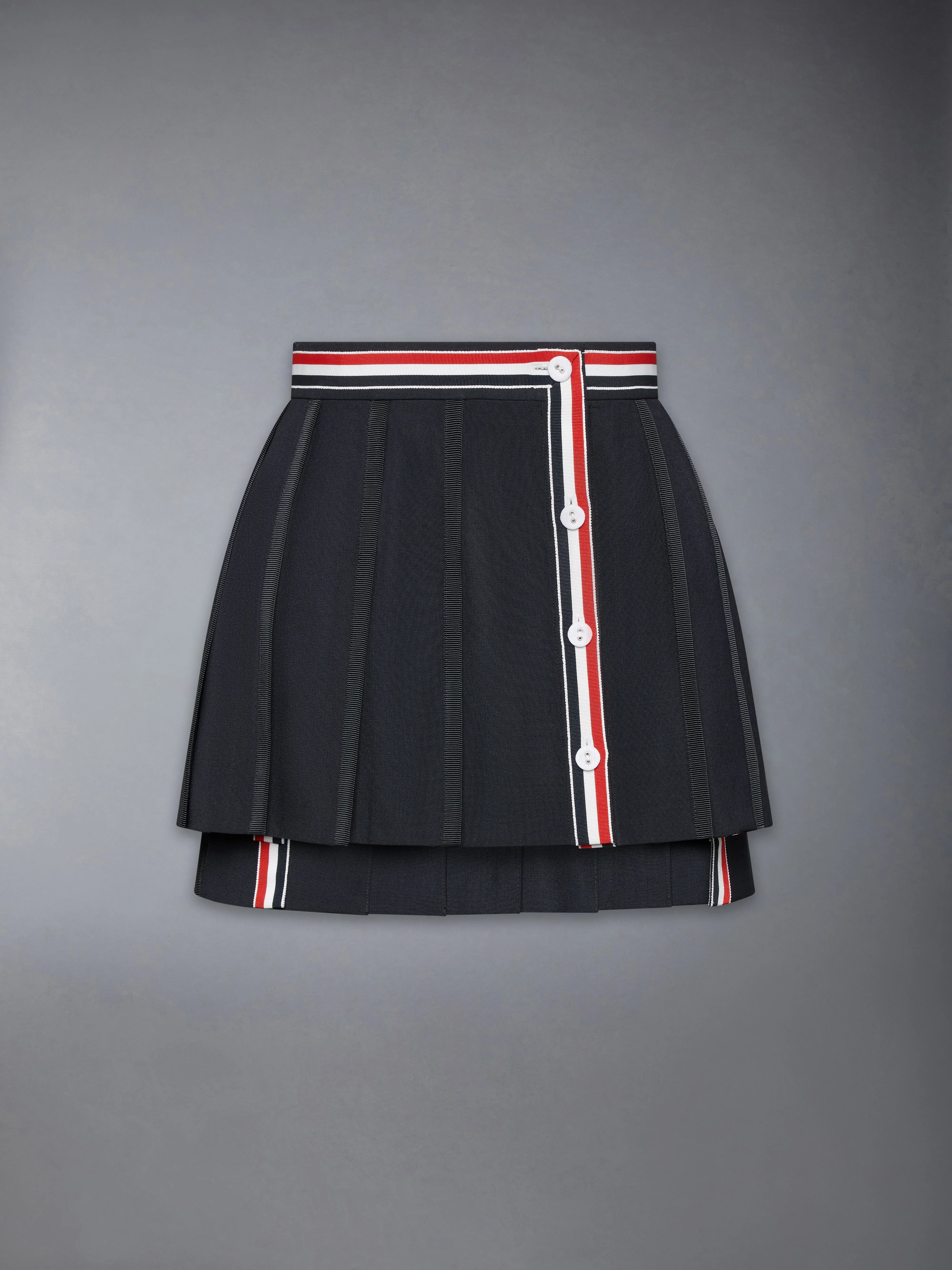 Crafted with signature Thom Browne emblems, this ultra-mini pleated skirt exudes playful energy and timeless style. Versatile and fun, it can be layered over one of our signature dress shirts or worn on its own for a bold statement. Front button closure with signature striped grosgrain trim Dropped back hem with signature striped grosgrain trim Signature striped grosgrain loop tab Model is 5'10" (178 cm), wearing size 40 50% Wool, 50% Polyester Made in Italy FGCA27A-02872-001