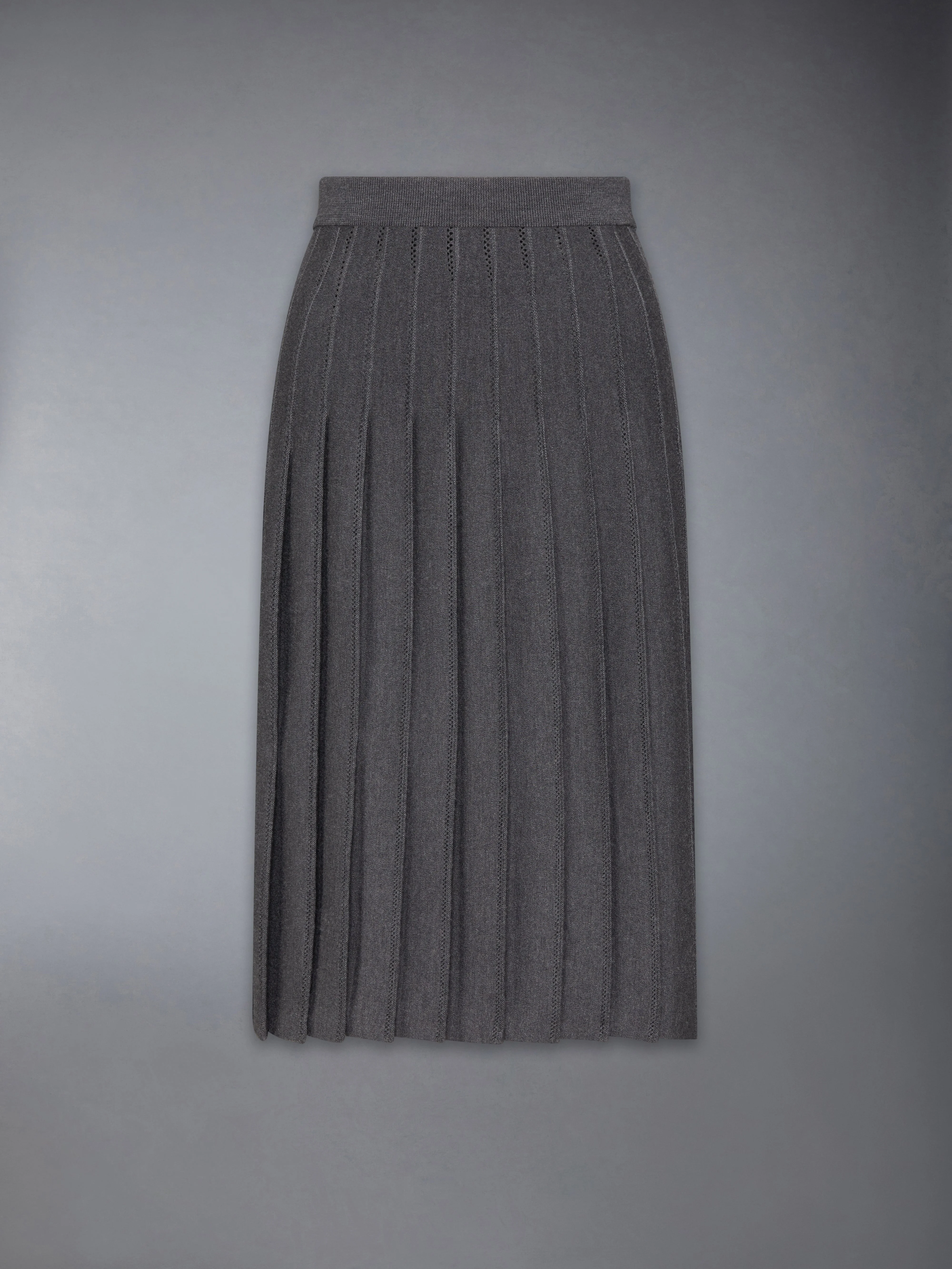 A skirt that delivers ultimate warmth and comfort, designed to pull on easily for effortless wear. Delicate pointelle stitching at the pleats highlights Thom Browne’s meticulous attention to detail, while its breathability ensures all-day comfort. Side zip closure Signature striped grosgrain loop tab Model is 5'10" (178 cm), wearing size 40 70% Wool, 30% Silk Made in Italy FKK144A-Y1058-035