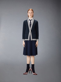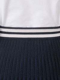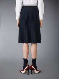 Crisp, classic, and endlessly versatile, this skirt is crafted from a luxurious blend of silk and Merino wool. A contrast waistband accented by signature cricket stripes is a nod to mid-century sports uniforms. Pair it with our Tuck Stitch Silk Cashmere & Wool Elongated V-Neck Cardigan. Pull on Below the knee length Model is 5'10" (178 cm), wearing size 40 87% Wool, 13% Polyester Combo 1: 45% Wool, 6% Polyester, 49% Silk Made in Italy FKK146B-Y4007-415
