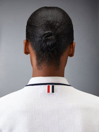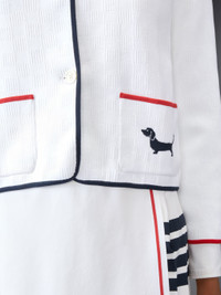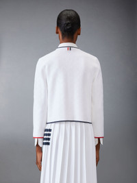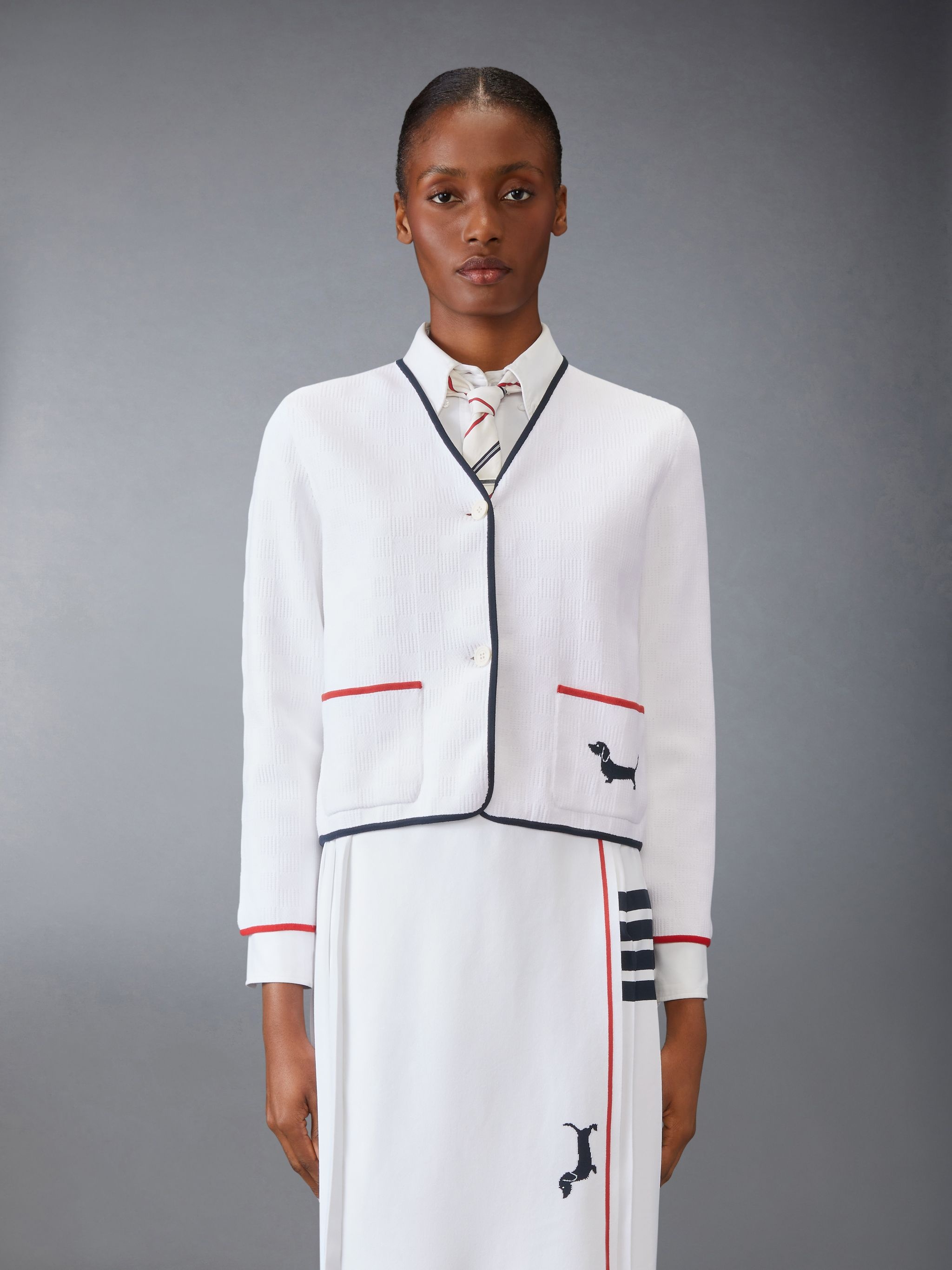 DETAILS & FIT This luxurious cardigan captures attention with its striking white base and bold red and blue detailing. Minimalist yet distinctive, it exemplifies Thom Browne's mastery of innovative design and tailored excellence, making it a true statement piece. Heralded as the most famous dog muse in fashion, Thom Browne’s very own dachshund Hector served as the inspiration behind this piece. Pair it with our 4-bar Pleated Hector Skirt. Front button closure 2 Front patch pockets Signature striped grosgrain loop tab Model is 5'10" (178 cm), wearing size 40 83% Viscose, 17% Polyester Made in Italy FKJ108B-Y5502-100