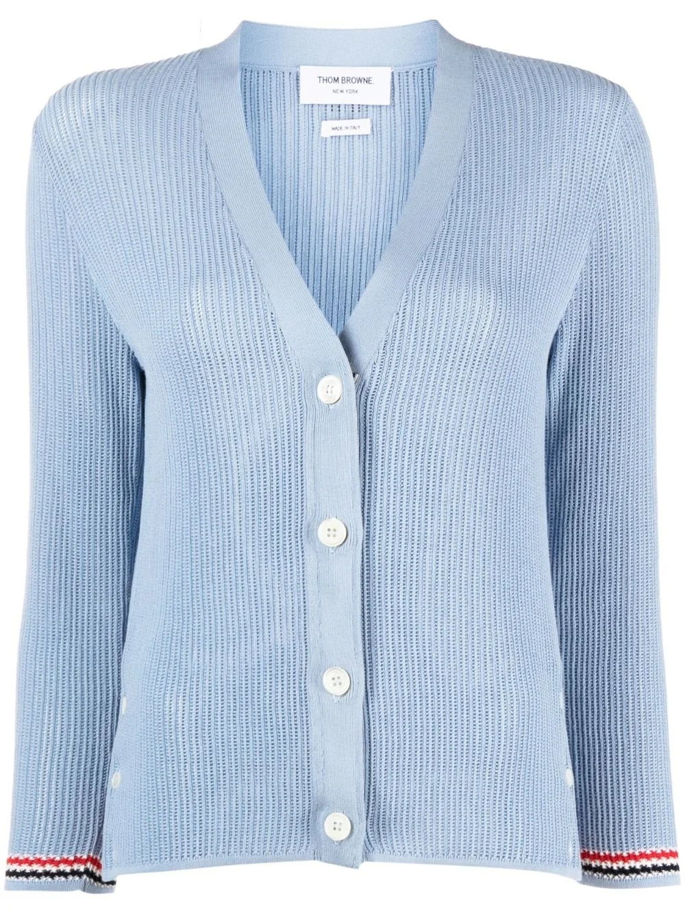 pointelle-knit RWB stripe cardigan Crafted from a cotton-silk blend in an intricate pointelle knit design, this Thom Browne cardigan boasts a classic V-neck and contrasting RWB stripe trim, showcasing the brand's penchant for timeless silhouettes and signature touches. Highlights - Light blue - Cotton-silk blend - Pointelle knit - Rwb stripe - V-neck - Front button fastening - Long sleeves - Straight hem Made in Italy Composition Cotton 70%, Silk 30% SIZE & FIT Model measurements Height 5 ft 11 in(1.8 m) Bust/Chest 31.88 in(81 cm) Hips 35.03 in(89 cm) Waist 24.01 in(61 cm) FittingInformation Designed for a slim fit that sits just away from the body offering a close yet comfortable fit Made with a lightweight knit, this piece offers some stretch This piece fits true to size – take your usual size