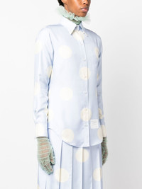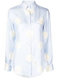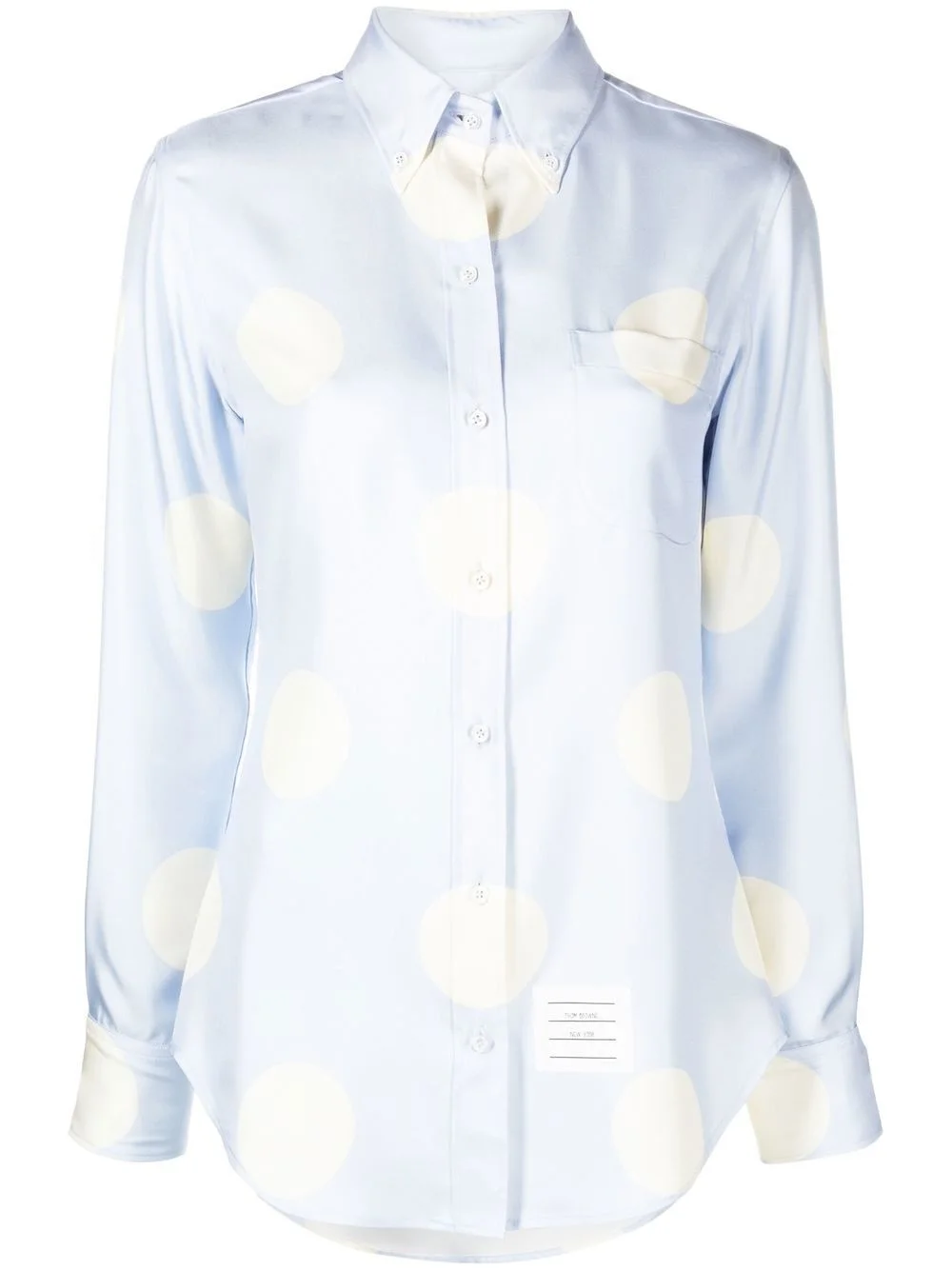 polka-dot silk long-sleeve shirt oxford blue silk bold polka dot print pointed flat collar logo patch to the front chest patch pocket front button fastening long sleeves buttoned cuffs curved hem Made in Italy Composition Silk 100% SIZE & FIT Model measurements Height 5 ft 11 in(1.8 m) Bust/Chest 31.88 in(81 cm) Hips 35.03 in(89 cm) Waist 24.01 in(61 cm) FittingInformation This piece fits true to size. We recommend you get your regular size Cut for a loose fit Made with a mid-weight non-stretch fabric