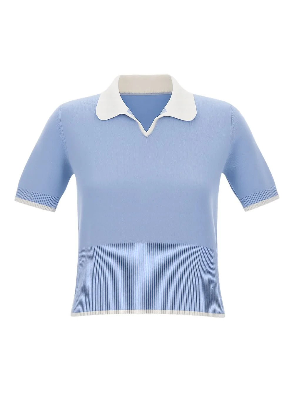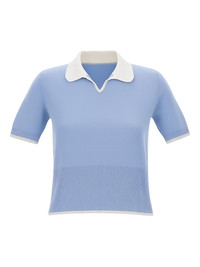 ribbed-knit short-sleeve polo top Highlights - Light blue - Short sleeves - Ribbed hem - V-neck - Contrasting collar - Knitted texture Made in Italy Composition Cashmere 100% SIZE & FIT FittingInformation Designed for a slim fit that sits just away from the body offering a close yet comfortable fit Made with a midweight knit, this piece offers some stretch Washing instructions Read Manufacturer Guidelines