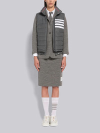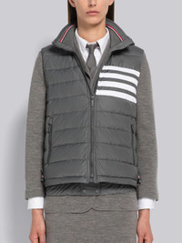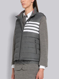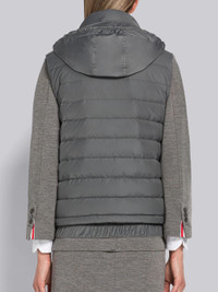 DETAILS & FIT Down-filled funnel neck vest in medium grey poly twill with roll-out hood and 4-bar stripe detail at left chest in white. Tonal front zip closure, funnel neck with stowaway hood and striped rib lining. Zip side pockets, elasticated hem, striped lining with interior zip pocket. Signature striped grosgrain loop tab at back of neck. Model is 5'10" (178 cm), wearing size 40 100% Polyester Combo1: 100% Polyester Padding: 80% White Goose Down, 20% White Goose Feathers Lining: 100% Polyester Made in Italy FVD015X07259035