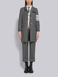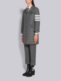 DETAILS & FIT Quilted tech down Chesterfield coat in medium grey poly twill with 4-bar stripe detail at left sleeve in white. Covered button closure, notched lapels, 2 flap front pockets, single chest pocket. Buttoned cuffs with signature striped grosgrain trim. Buttoned double back vent. Striped lining with interior pocket and name tag. Signature striped grosgrain loop tab at back of neck. Model is 5'10" (178 cm), wearing size 40 100% Polyester Combo1: 100% Polyester Padding: 85% White Goose Down, 15% Polyester Lining: 100% Polyester Made in Italy FOD078X07259035