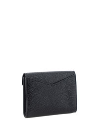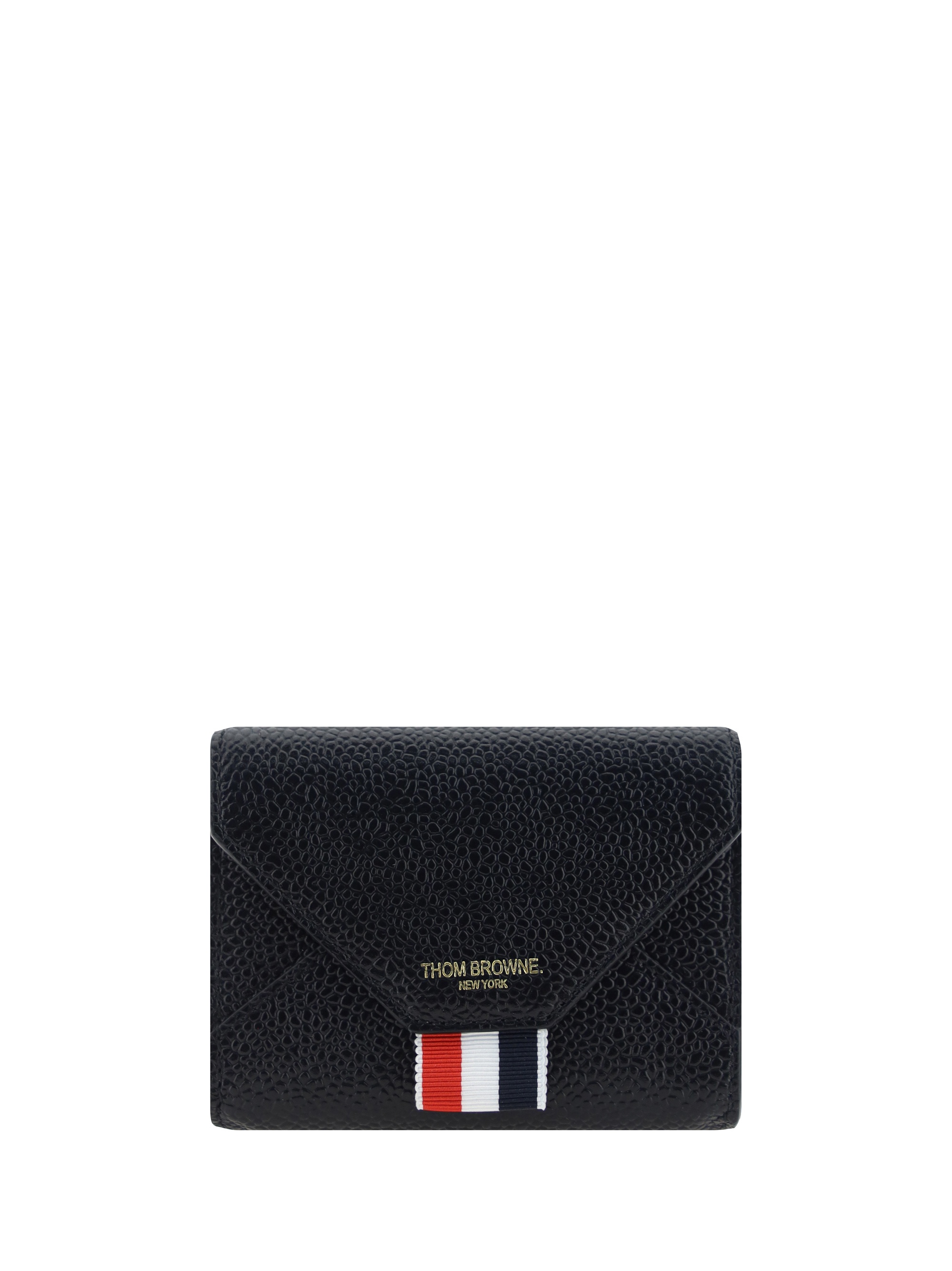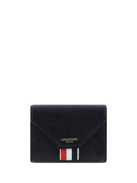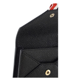 Calfskin Card Holder by Thom Browne, front flap closure with concealed button, interior card slot, iconic brand signature press-stamped on front flap embellished with RWB webing patch. DETAILS sku FAW063A00198_001 composition : CALF LEATHER BOS TAURUS 100% color group : BLACK gender : WOMAN season : SS24 size chart : UNI category name : WALLETS dimensions : 9 x 12 cm