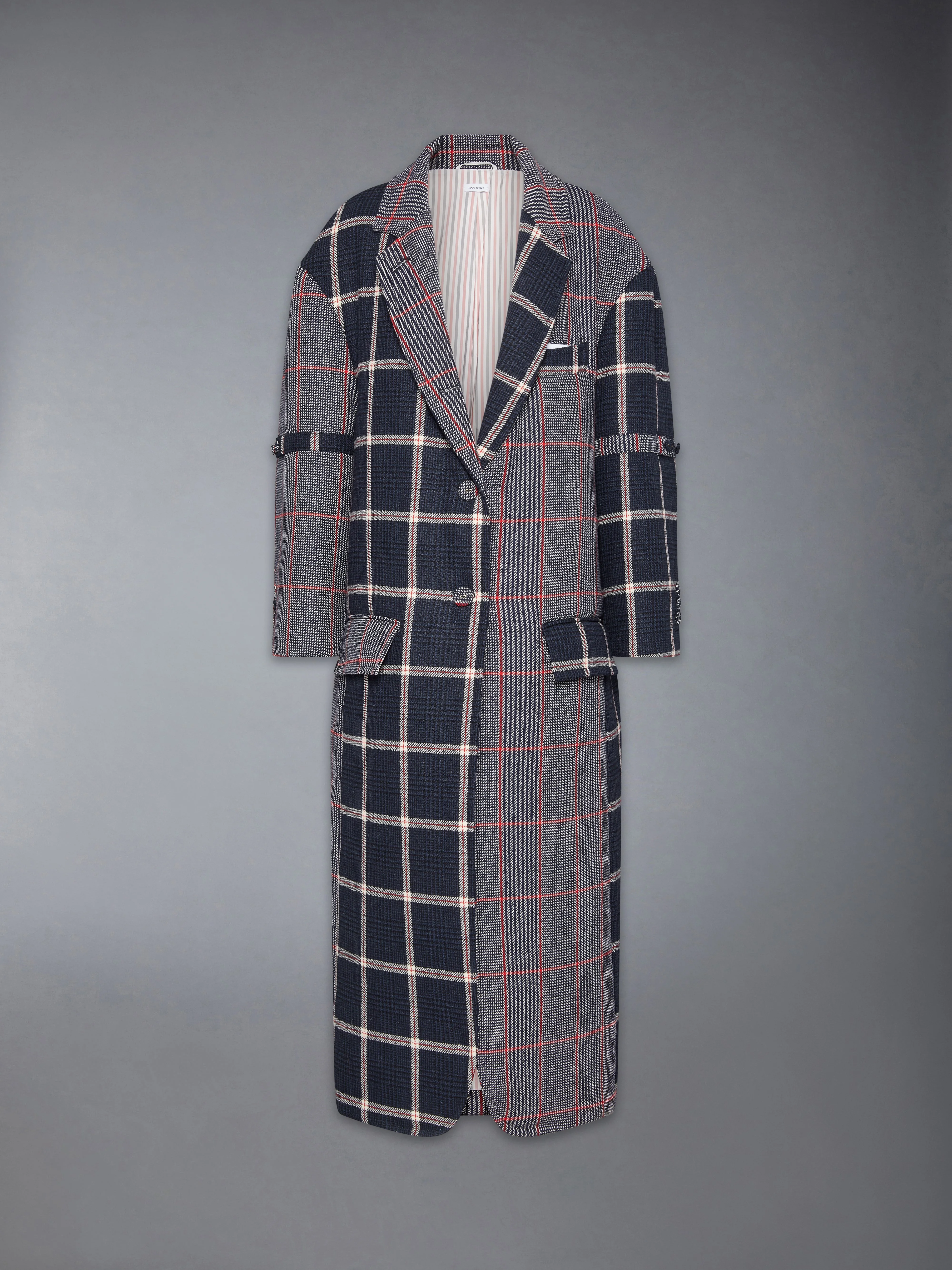 First debuted on the Thom Browne runway, this luxurious overcoat draws inspiration from the charm of country life. Contrasting hunting tweed fabrics, sourced from a renowned Scottish mill, are woven together in patchwork form. Hallmarks of traditional men’s tailoring reach from the outside in—self-covered armbands and buttons—each a reflection of Thom’s unwavering devotion to craft. Hunting tweed has long been a symbol of refined tradition and functional elegance, beloved by the aristocracy and countryside adventurers. Today, it symbolizes sartorial excellence and is regarded for its luxury and rich legacy. Front button closure 2 Front flap pockets Single chest pocket Buttoned armbands Buttoned cuffs with signature striped grosgrain trim Interior pockets with name tag Double vented back with signature striped grosgrain trim Signature striped grosgrain loop tab Model is 5'10" (178 cm), wearing size 40 100% Wool Padding:85% White Goose Down, 15% Polyester Lining: 100% Polyester Made in Italy FOR104Y-06022-415