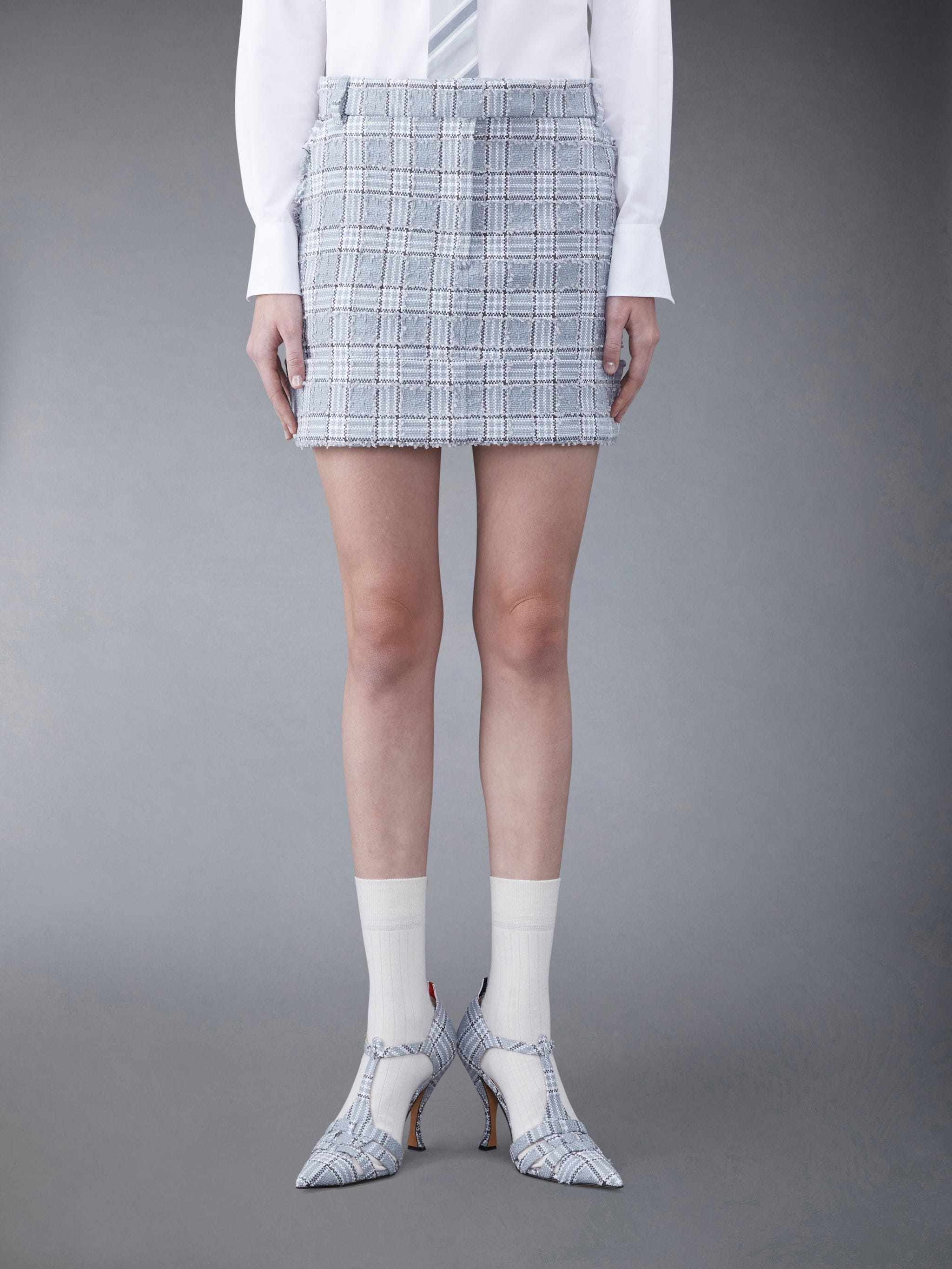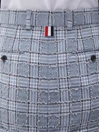 DETAILS & FIT Sack mini skirt in Prince of Wales checked cotton tweed with frayed detailing throughout. Tab closure, flat front, beltloops, wide cuff. Slip side pockets, button-fastening back welt pockets. Signature striped grosgrain loop tab at back waist. Sack - Fit 2. Model is 5'10" (178 cm), wearing size 40 92% Cotton, 8% Polyamide Lining: 100% Silk Made in Italy FGC982TF0372035