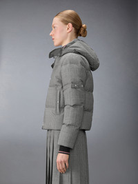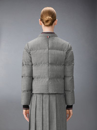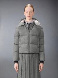 A cold-weather piece with a tailored twist. This down-filled jacket reimagines traditional suiting codes in a patchworked mix of houndstooth and Prince of Wales checks. Rendered in structured wool suiting, the mismatched patterns create a rhythm of contrast—graphic, precise, and intentionally playful. A detachable hood adds seasonal versatility. Complete the look with the season’s All-Terrain Boot—blending rugged functionality with elevated design. Front two-way zip closure Drawcord removable hood with RWB-detailed stoppers Ribbed bomber collar with RWB intarsia tipping Welt hand pockets with snap Two interior buttoned and zip pockets Ribbed cuffs with RWB intarsia tipping Signature striped grosgrain loop tab Model is 5'10" (178 cm), wearing size 40 100% Wool Combo 1: 100% Wool Combo 2: 95% Wool, 3% Polyamide, 2% Elastane Combo 3: 80% White Goose Down, 20% White Goose F Made in Italy FBD074Y-F1083-980