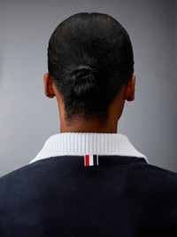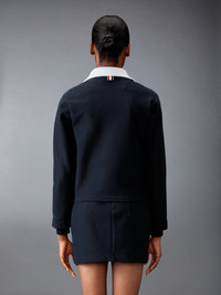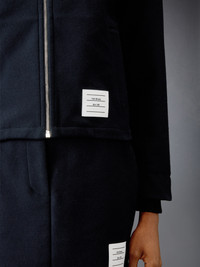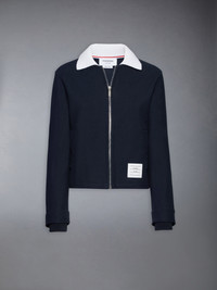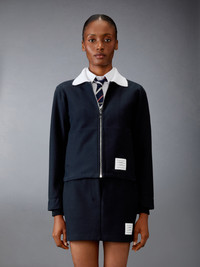 Impeccable craftsmanship, luxurious fabric, and distinctive Thom Browne emblems make this jacket an essential garment for your seasonal wardrobe. Layer it over any of our signature dress shirts or tees. Front zip closure Slip side pockets Name tag applique Signature striped grosgrain loop tab Model is 5'10" (178 cm), wearing size 40 100% Cotton Made in Italy FJT375A-J0042-415