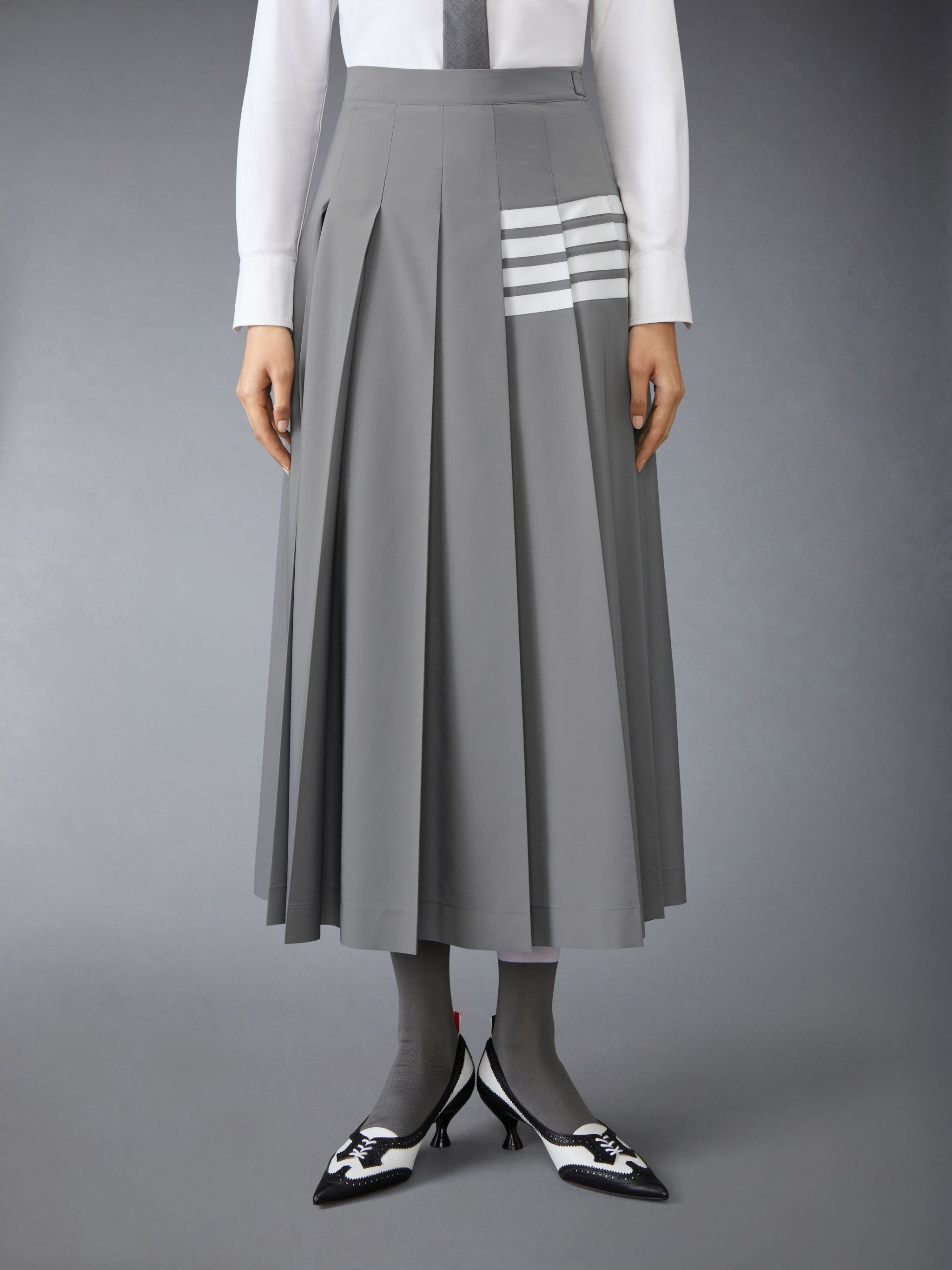 DETAILS & FIT Look polished and sophisticated amidst spring showers with our Ripstop 4-Bar Pleated Skirt. A classic Thom Browne silhouette, this versatile number will be a staple in your seasonal wardrobe for years to come. Our Ripstop fabric is ultra-durable, tear and rip-resistant with a water-repellent finish. Side zip closure 4-bar detailing Signature striped grosgrain loop tab Model is 5'10" (178 cm), wearing size 40 100% Nylon Made in Italy FJK138A-08031-035
