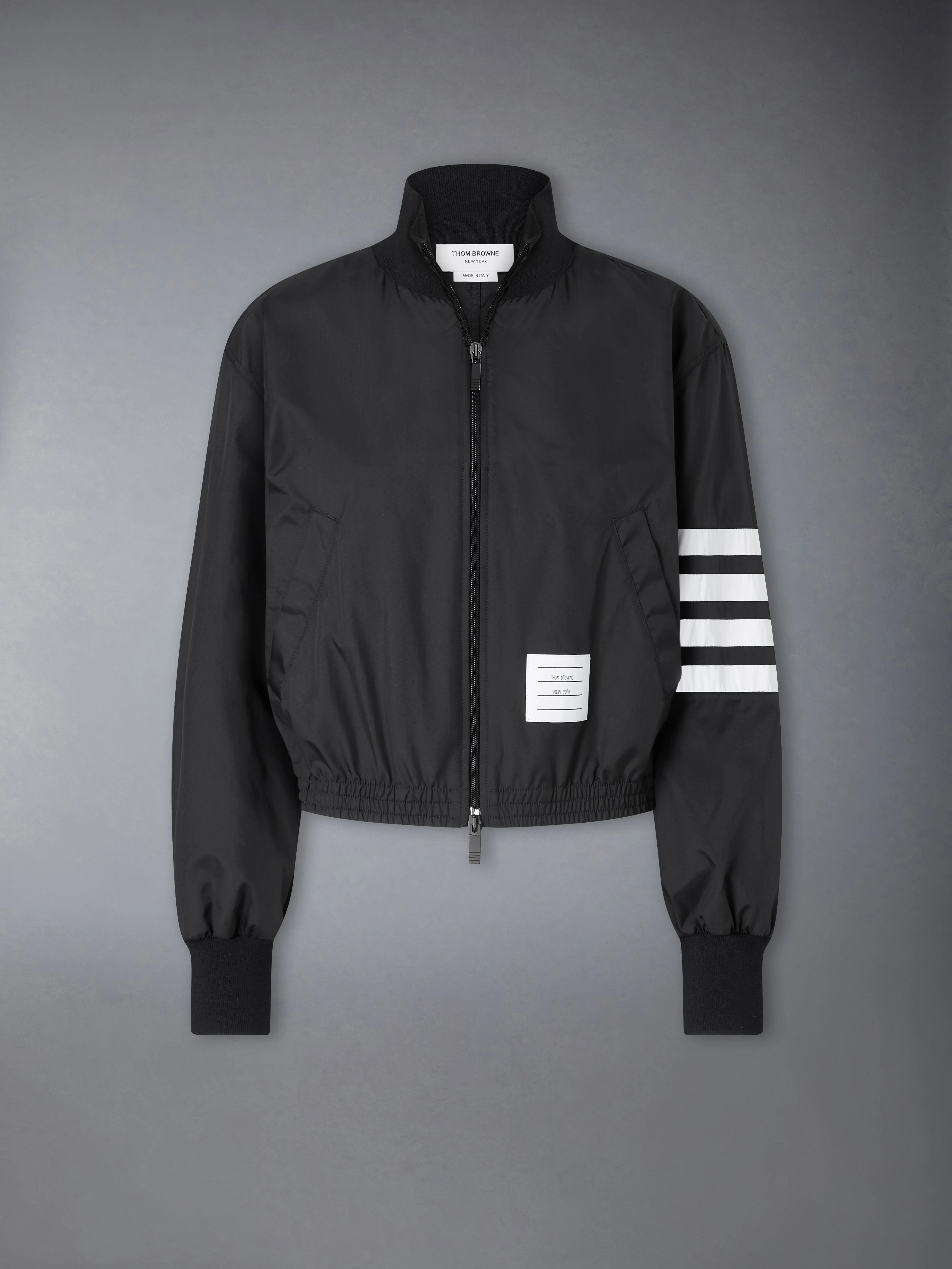Drawing from athletic codes, this track jacket brings a sense of play to a familiar form, translating technical construction into a contemporary silhouette. Rendered in lightweight ripstop, the fabric adds a crisp surface and subtle strength to the design, grounded by Thom Browne’s signature detailing. Pair with the matching pleated mini skirt for a contemporary, sport-forward look. Front matte two-way zip closure with 4-bar detailing Ribbed stand collar and cuffs Welt hand pockets with hidden snap Elasticated channel-stitched hem Engineered 4-bar detailing Name tag applique Signature striped grosgrain loop tab Model is 5'10" (178 cm), wearing size 40 81% Polyamide, 19% Polyester Made in Italy FBC952U-F1095-001