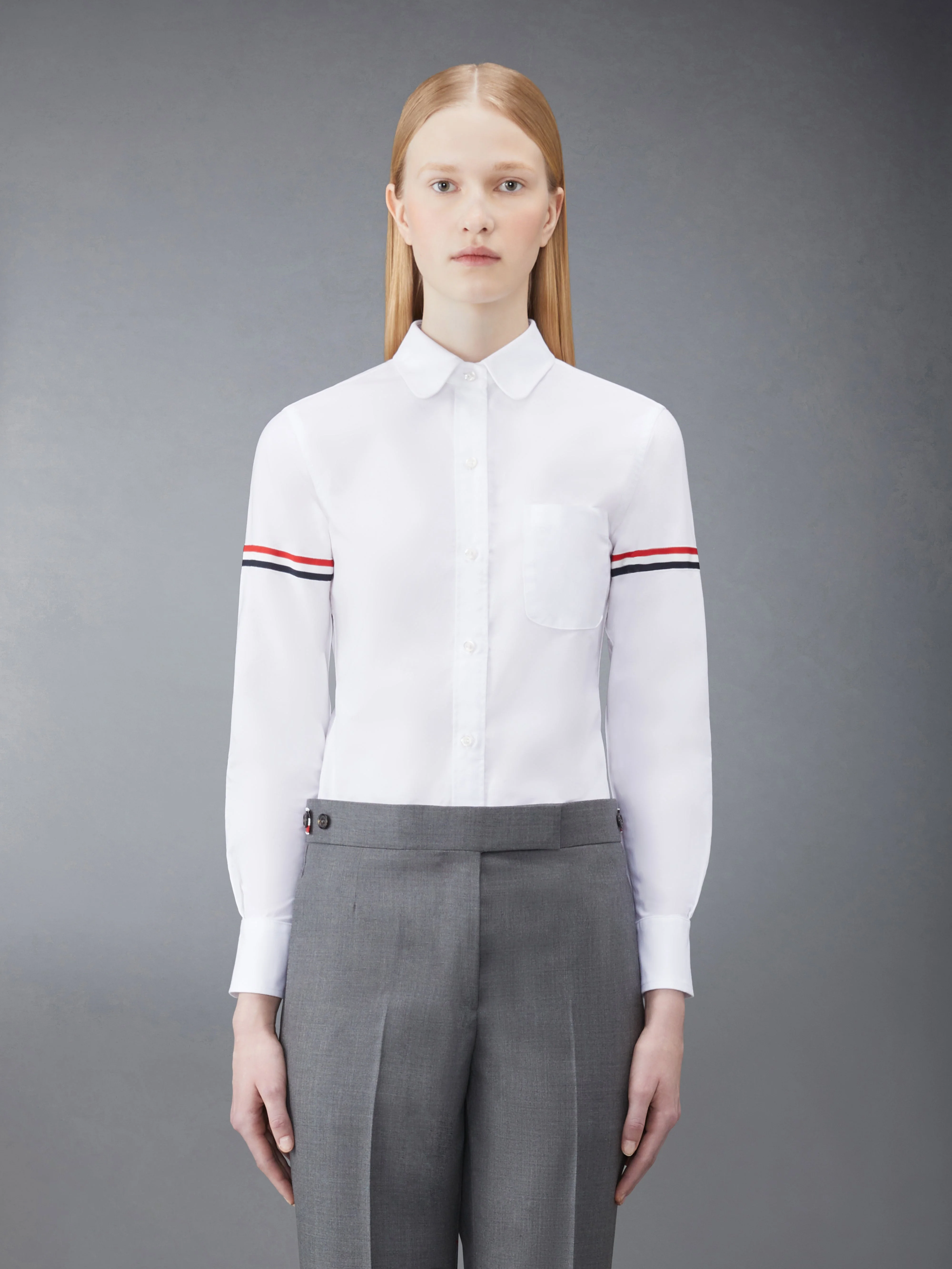 DETAILS & FIT A Thom Browne essential, our Oxford Round Collar Armbands Classic Shirt exhibits quality craftsmanship and meticulous tailoring. Armbands on sleeve Front button closure Patch chest pocket Name tag applique above Rounded hem Signature striped grosgrain loop tab at back of neck Model is 5' 10"" (178 cm), wearing size 40 100% Cotton Made in Italy FLL019E-F0313-100