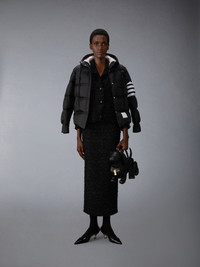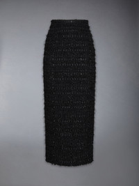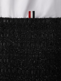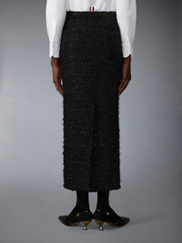 This hobble skirt reimagines eveningwear through the lens of festive formality. Crafted in satin ribbon tweed, one of the season’s most intricate materials, its surface is woven from ten different yarns including satin ribbon and grosgrain for a richly dimensional and luminous finish. Frayed edges push the polish just enough, striking a balance between craft and modernity in true Thom Browne fashion. Calf length High rise Side zip closure with RWB-detailed pull Back vent with RWB grosgrain trim Silk tricolor striped lining Signature striped grosgrain loop tab Model is 5'10" (178 cm), wearing size 40 55% Polyester, 37% Cotton, 7% Polyamide, 1% Acrylic Lining: 100% Silk Made in Italy FGCA45T-F1091-001