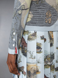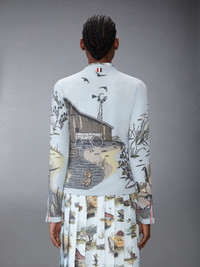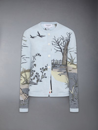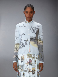 Inspired by heritage heavy weight silk scarfs, much is depicted in this artful cardigan, where migrating geese soar overhead a serene, quiet landscape filled with hay and barn life. Be transported to quiet times, the beauty of nature, and simple joys with a sweater crafted from fine cashmere and silk twill fabric. Layer it over a striped poplin shirt, or our Scenic Intarsia Cashmere Shell Top. Front button closure with striped grosgrain placket Buttoned cuffs with signature striped grosgrain trim Signature striped grosgrain loop tab Model is 5'10" (178 cm), wearing size 40 100% Cashmere Lining 1: 100% Silk Made in Italy FKC656A-Y2007-472