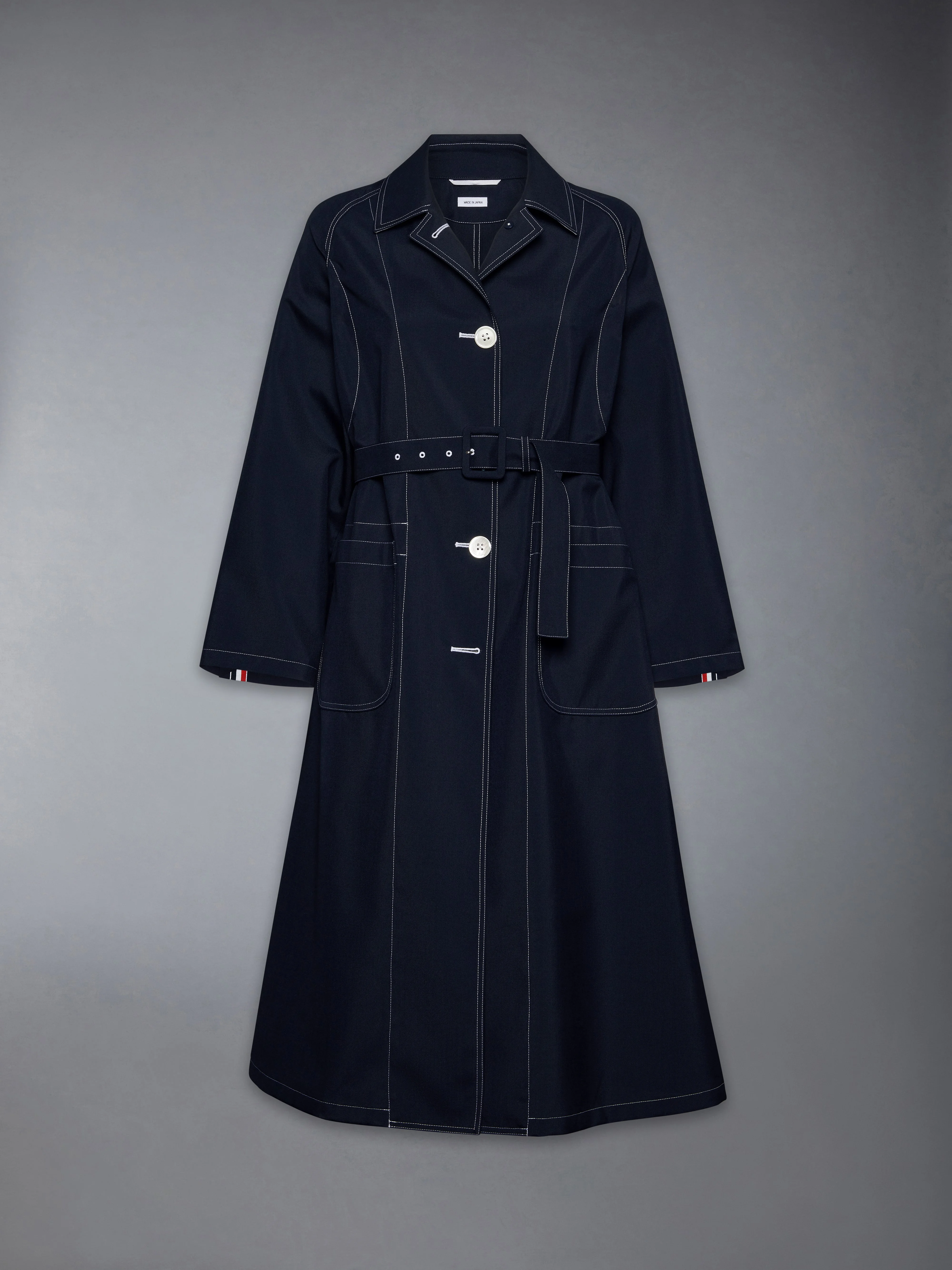 DETAILS & FIT Tailored to perfection, our School Uniform Car Coat effortlessly elevates any outfit. Luxurious fabrics, intricate contrast stitching, and other thoughtfully curated details woven throughout are sure to leave a lasting impression. Front button closure 2 Front patch pockets Belted waist Interior pocket with name tag Single back vent Signature striped grosgrain loop tab Model is 5'10" (178 cm), wearing size 40 50% Wool, 50% Polyester Lining: 100% Cupro Made in Japan FOC871U-02872-415