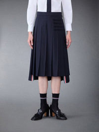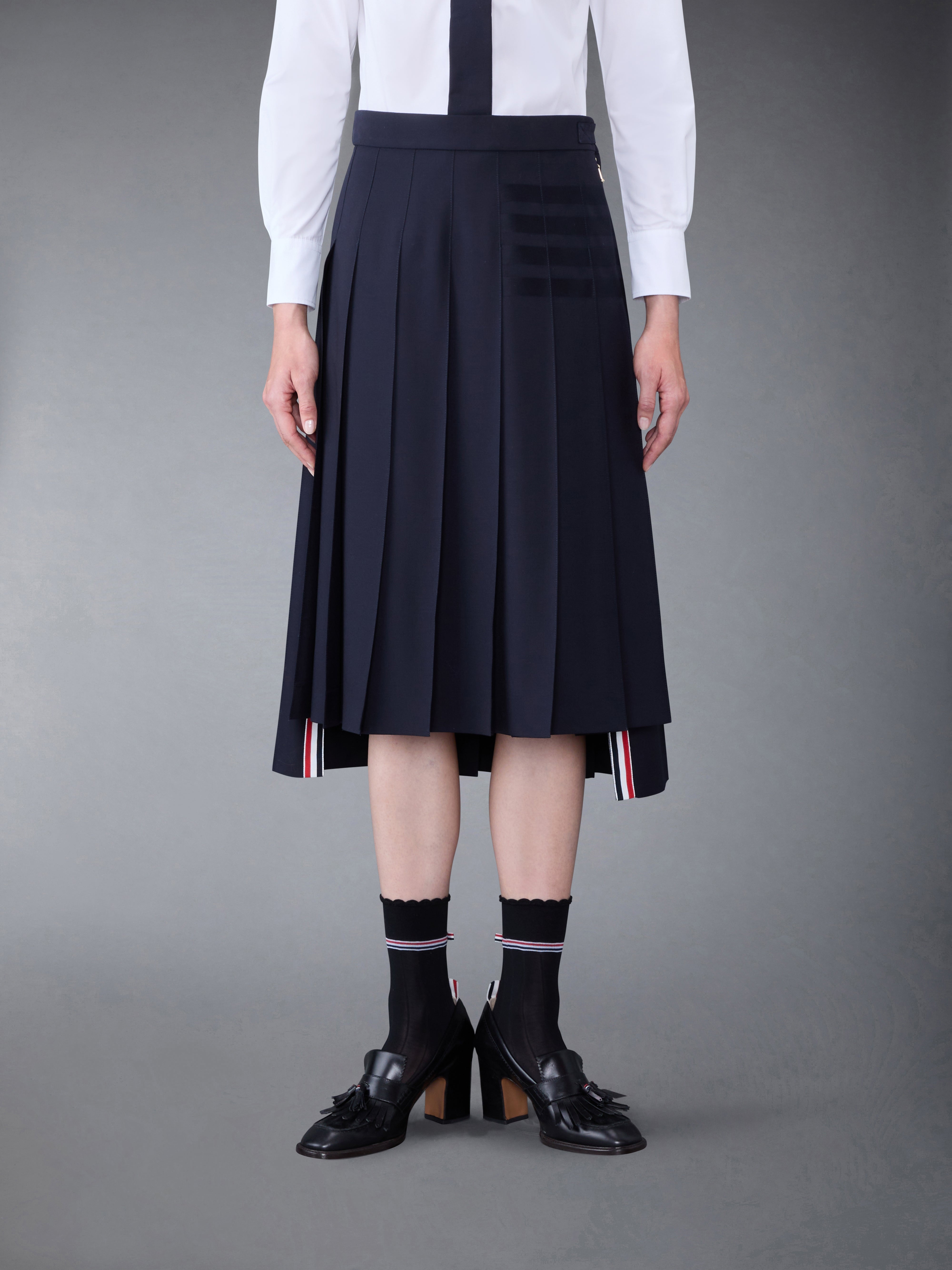 Below-the-knee pleated skirt in navy plain weave suiting with tonal engineered 4-bar stripe detail at left hip. Side zip closure with buttoned tab. Dropped back hem with signature striped grosgrain trim. Signature striped grosgrain loop tab at back waist. Model is 5'10" (178 cm), wearing size 40 100% Wool Made in Italy FGC400V-06146-420