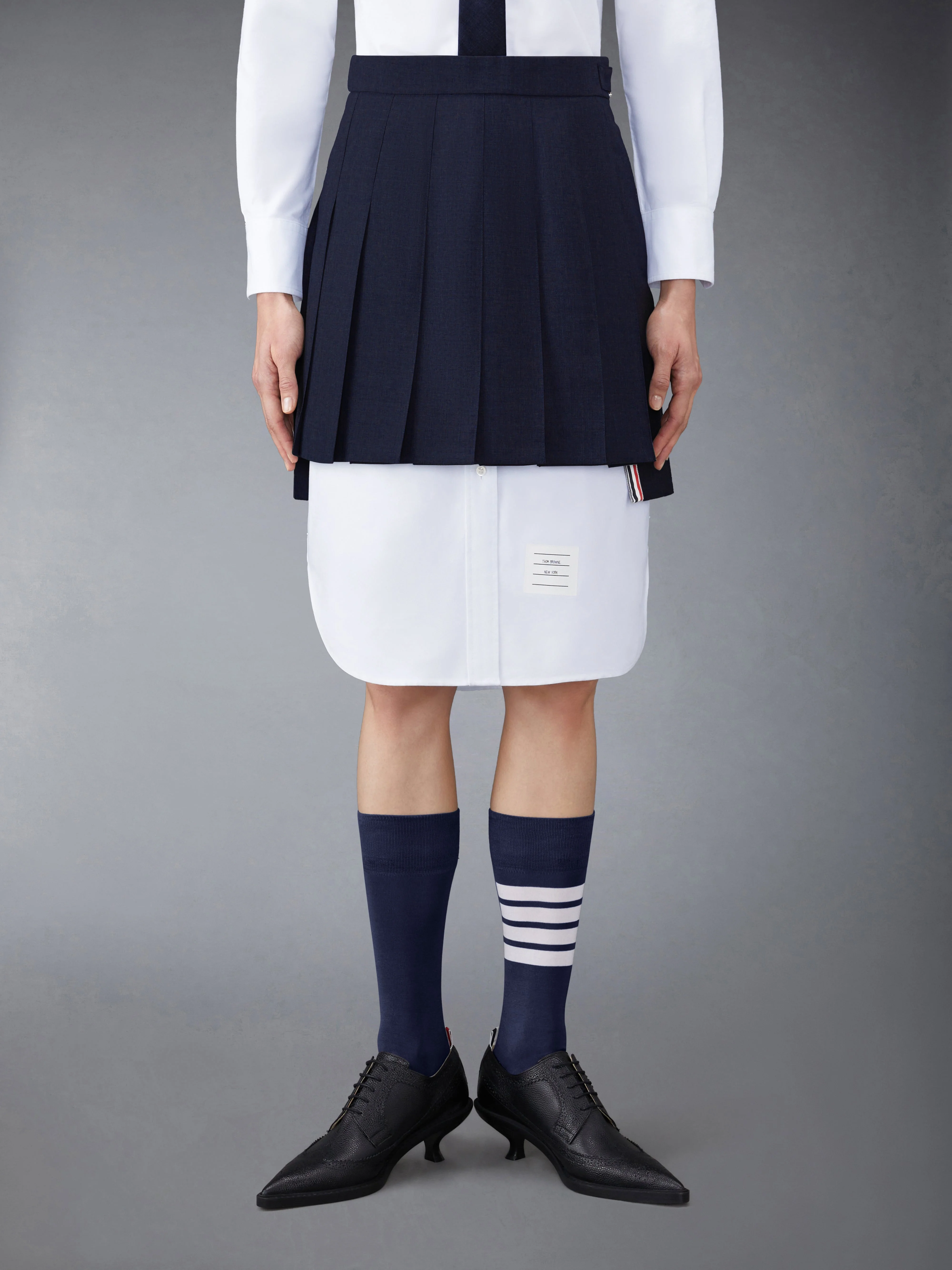 DETAILS & FIT Inspired by East Coast preppy icons but reimagined with inventive proportions and quality craftsmanship, our Plain Weave School Uniform Thigh Length Dropped Back Pleated Skirt is a fresh take on a traditional silhouette. Side zip closure Adjustable button backstrap Dropped back hem with signature grosgrain trim Signature striped grosgrain loop tab at back waist Model is 5' 10" (178cm), wearing size 40 50% Wool, 50% Polyester Lining: 100% Cupro Made in Italy FGC402V-02872-415 - Length: 46.0cm - WAIST: 70.0cm