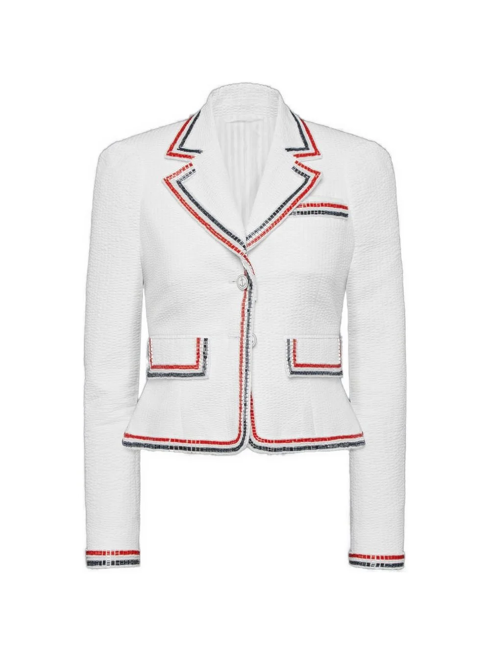 seersucker jacket Highlights - White - Striped trim - Single-breasted - Front button fastening - Notched lapels - Front flap pockets Made in Italy Composition Outer: Cotton 100% Lining: Cupro 100% Washing instructions Read Manufacturer Guidelines