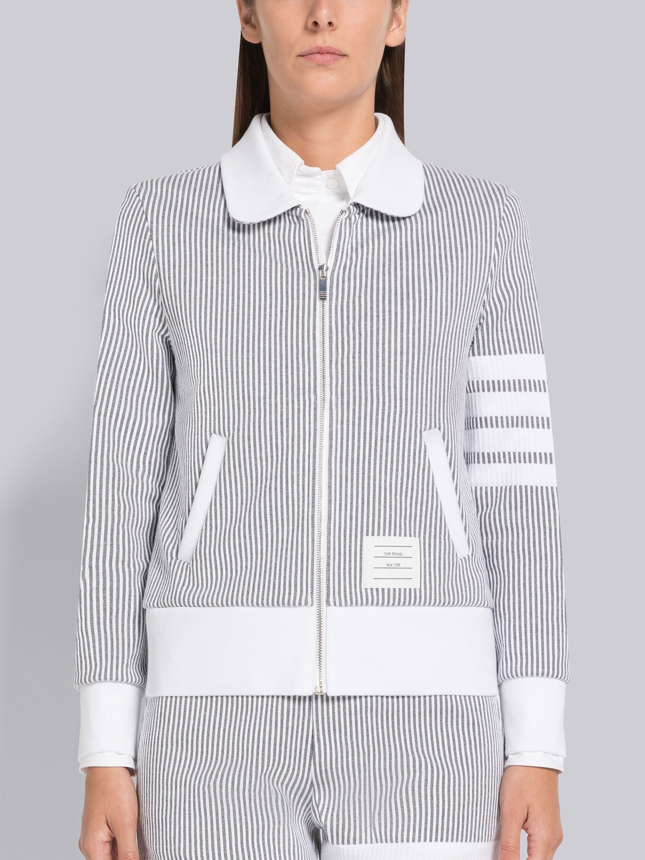 DETAILS & FIT Round collar zip jacket in seersucker loopback with engineered 4-bar stripe detail at left sleeve in white. Front zip closure. Contrast collar, cuffs, and hem in white. Slant welt pockets, name tag applique above hem. Signature striped grosgrain loop tab at back of neck. Made in Italy 100% Cotton FJT260AJ0063055