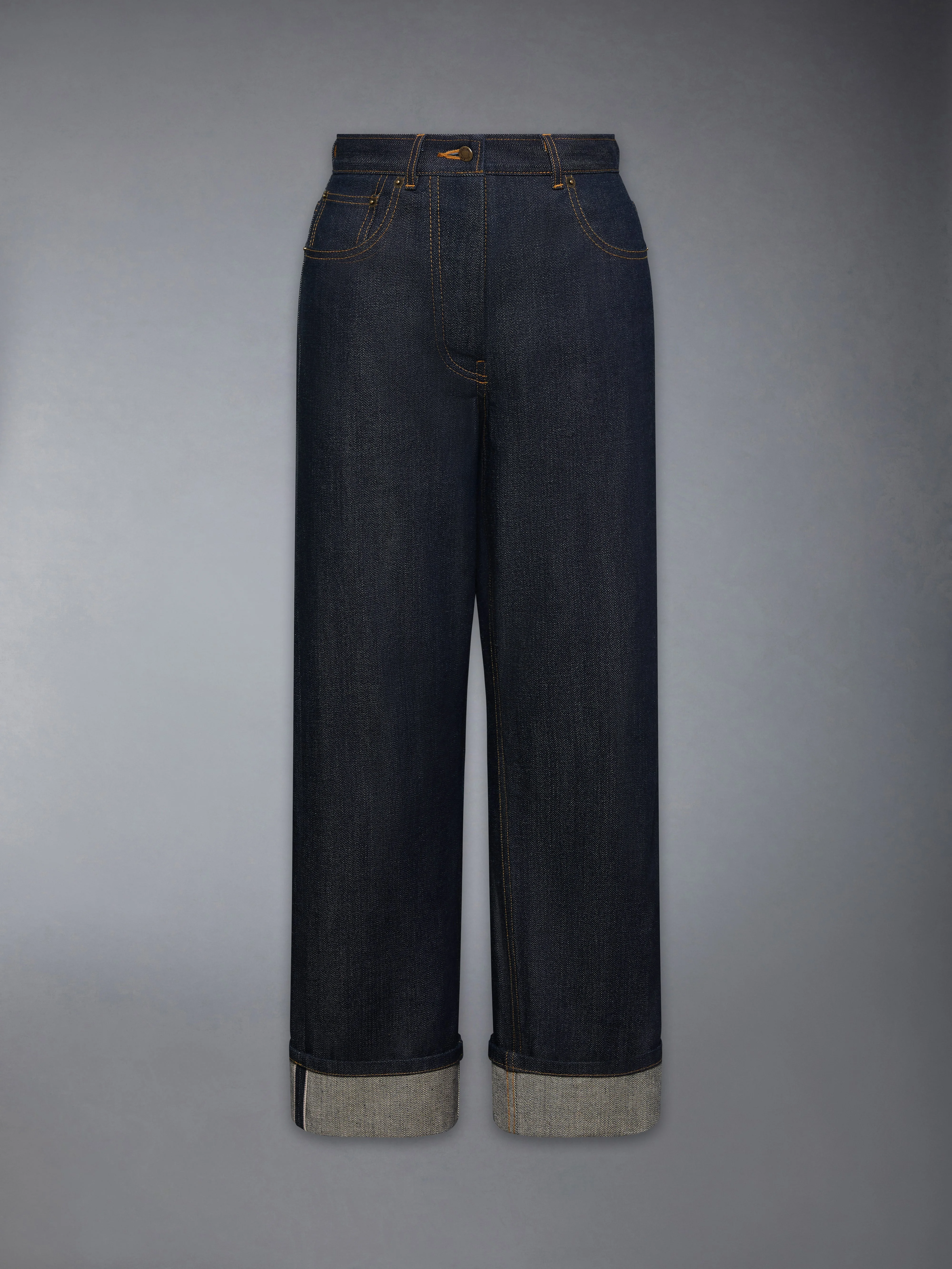 Cut in 13.75 oz selvedge denim from Japan, a country long regarded for its excellence in denim craft, these 5-pocket jeans feature off-white weft yarns that produce warmer, softer tones beneath the indigo dye. The raw finish is treated to reduce color transfer, preserving contrast while allowing the structured fabric to soften and evolve with wear. Pair with the Nappa Leather High-Heel Wingtip Bootie to elevate everyday denim. Button fly closure Adjustable buttoned backstrap Selvedge detail visible at inner cuffs Signature striped grosgrain loop tab Model is 5'10" (178 cm), wearing size 40 100% Cotton Made in Japan FTC509U-F1101-415