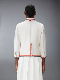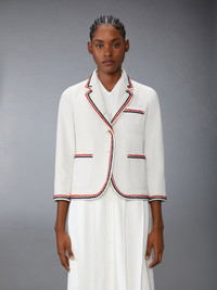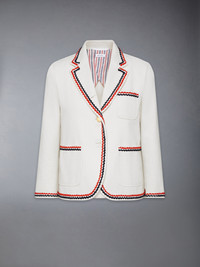 With a relaxed fit, this eye-catching sport coat effortlessly blends casual ease with refined elegance. Black and red scalloped stitching beautifully contrasts with cream denim, while lustrous gold buttons add a touch of brilliance. Sophisticated yet effortless, the beauty is in the details. Complete the look with our Wide Leg Trousers in Selvedge Denim. Front button closure 3 Front patch pockets Buttoned cuffs with signature striped grosgrain trim Interior pockets with name tag Signature striped grosgrain loop tab Fit 2 Model is 5'10" (178 cm), wearing size 40 100% Cotton Lining: 100% Cupro Made in Italy FBC788B-F0950-100 FBC788B-F0950-100