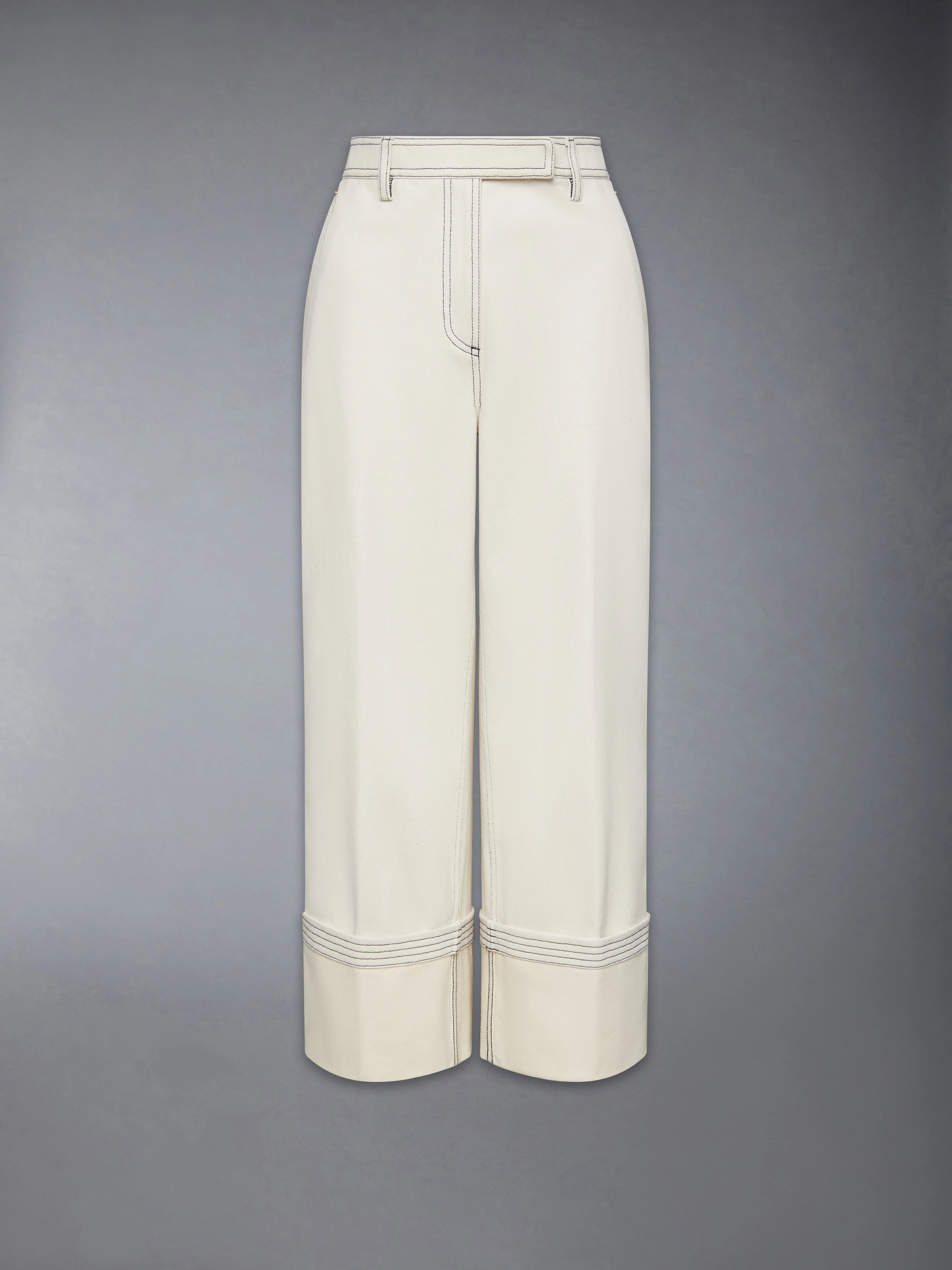 With a relaxed fit, these eye-catching trousers effortlessly blend casual ease with refined elegance. Black and red scalloped stitching beautifully contrasts with cream denim, while lustrous gold rivets add a touch of brilliance. Sophisticated yet effortless, the beauty is in the details. Complete the look with our Cropped Sack Patch Pocket Sport Coat in Selvedge Denim. Tab front closure 2 Back patch pockets Signature striped grosgrain loop tab Model is 5'10" (178 cm), wearing size 40 100% Cotton Made in Italy FTC505U-F0950-100 FTC505U-F0950-100