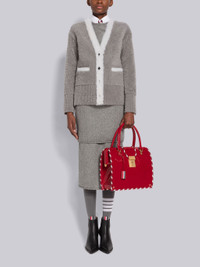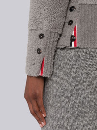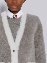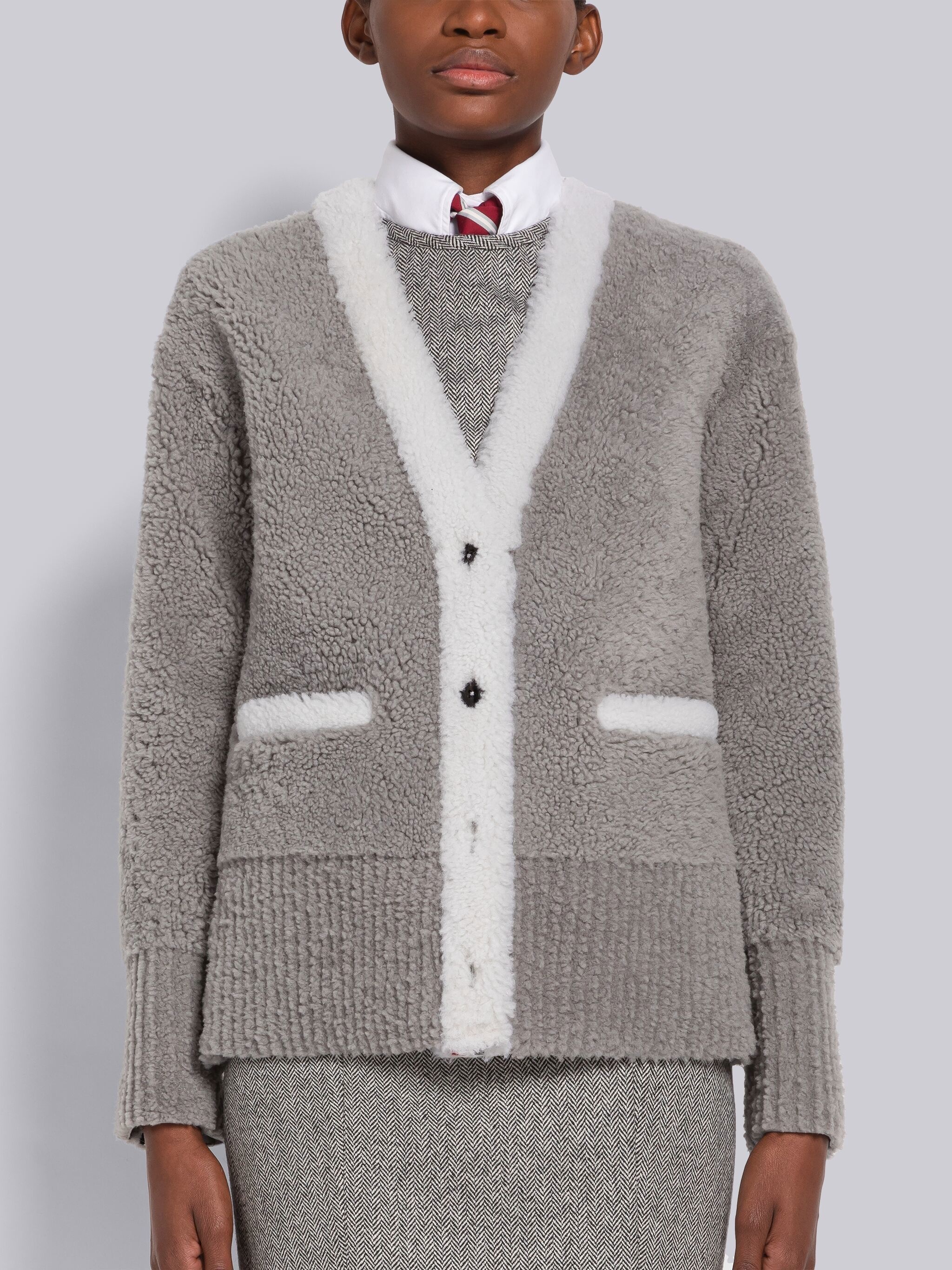 DETAILS & FIT V-neck cardigan jacket in medium grey shearling with contrast trim in white. Front button closure, 2 slip front pockets, ribbed shearling cuffs and hem. Buttoned cuffs with signature striped grosgrain trim. Signature striped grosgrain loop tab at back of neck. Model is 5'10" (178 cm), wearing size 40 100% Shearling Leather Combo1: 100% Shearling Leather Made in Italy FBC827C02821035