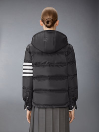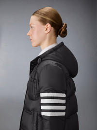 Shiny ripstop enters the collection as a lightweight, weather-resistant fabric, crafted into a down jacket that balances warmth with tailored form. A subtle sheen and durable grid texture bring depth to the material, while a shirtdress-inspired hem softens the silhouette. Complete the look with the season’s All-Terrain Boot—blending rugged functionality with elevated design. Front snap closure Drawstring hood with matte RWB-detailed aglets Patch chest pocket Welt hand pockets with snap Interior button pocket Snap-fastening cuffs Plain back yoke with locker loop Curved hem Tricolor lining 4-bar detailing Name tag applique Signature striped grosgrain loop tab Model is 5'10" (178 cm), wearing size 40 81% Polyamide, 19% Polyester Combo 1: 100% Polyester Combo 2: 80% White Goose Down, 20% White Goose Feathers Lining: 100% Made in Italy FBD076X-F1095-025