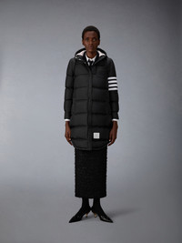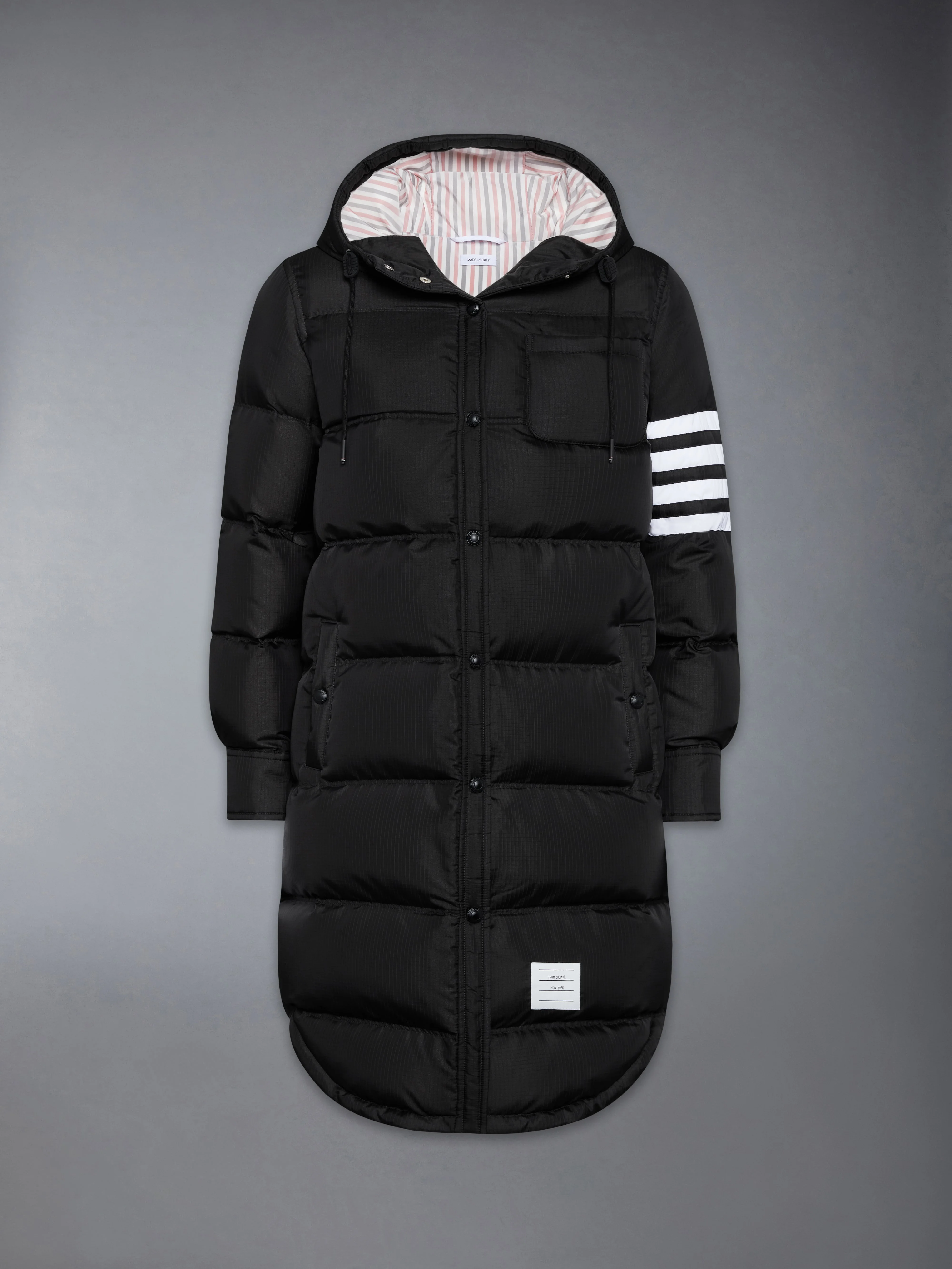 Shiny ripstop enters the collection as a lightweight, weather-resistant fabric, crafted into a down parka that balances warmth with tailored form. A subtle sheen and durable grid texture bring depth to the material, while a shirtdress-inspired hem softens the silhouette. Complete the look with the season’s All-Terrain Boot—blending rugged functionality with elevated design. Front snap closure Drawstring hood with matte RWB-detailed aglets Patch chest pocket Welt hand pockets with snap Interior buttoned pocket Snap-fastening cuffs Plain back yoke with locker loop Curved hem 4-bar detailing Name tag applique Signature striped grosgrain loop tab Model is 5'10" (178 cm), wearing size 40 81% Polyamide, 19% Polyester Combo 1: 100% Polyester Padding: 80% White Goose Down, 20% White Goose Feathers Lining: 100 Made in Italy FOD105X-F1095-001