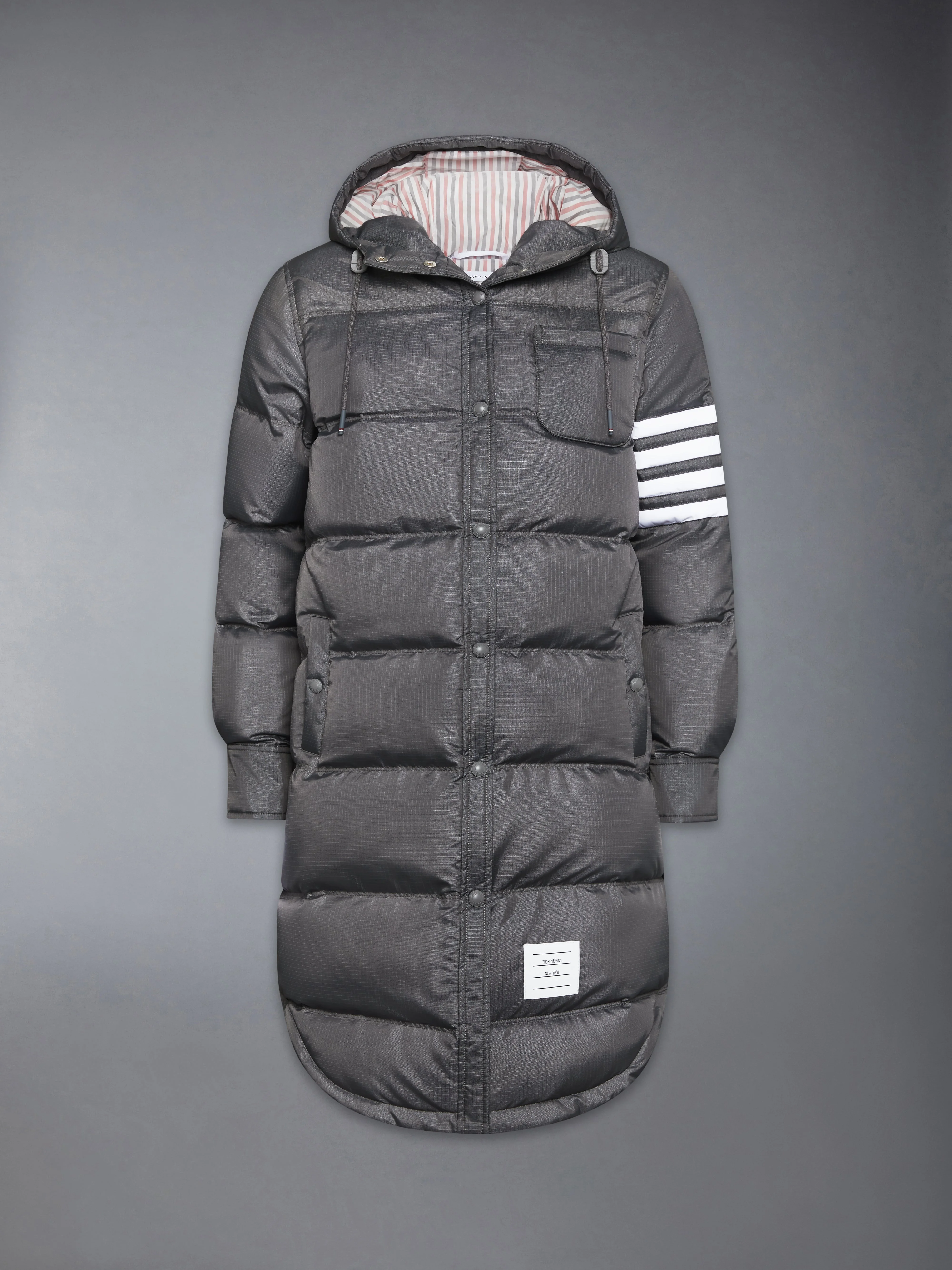 Shiny ripstop enters the collection as a lightweight, weather-resistant fabric, crafted into a down parka that balances warmth with tailored form. A subtle sheen and durable grid texture bring depth to the material, while a shirtdress-inspired hem softens the silhouette. Complete the look with the season’s All-Terrain Boot—blending rugged functionality with elevated design. Front snap closure Drawstring hood with matte RWB-detailed aglets Patch chest pocket Welt hand pockets with snap Interior buttoned pocket Snap-fastening cuffs Plain back yoke with locker loop Curved hem 4-bar detailing Name tag applique Signature striped grosgrain loop tab Model is 5'10" (178 cm), wearing size 40 81% Polyamide, 19% Polyester Combo 1: 100% Polyester Padding: 80% White Goose Down, 20% White Goose Feathers Made in Italy FOD105X-F1095-025