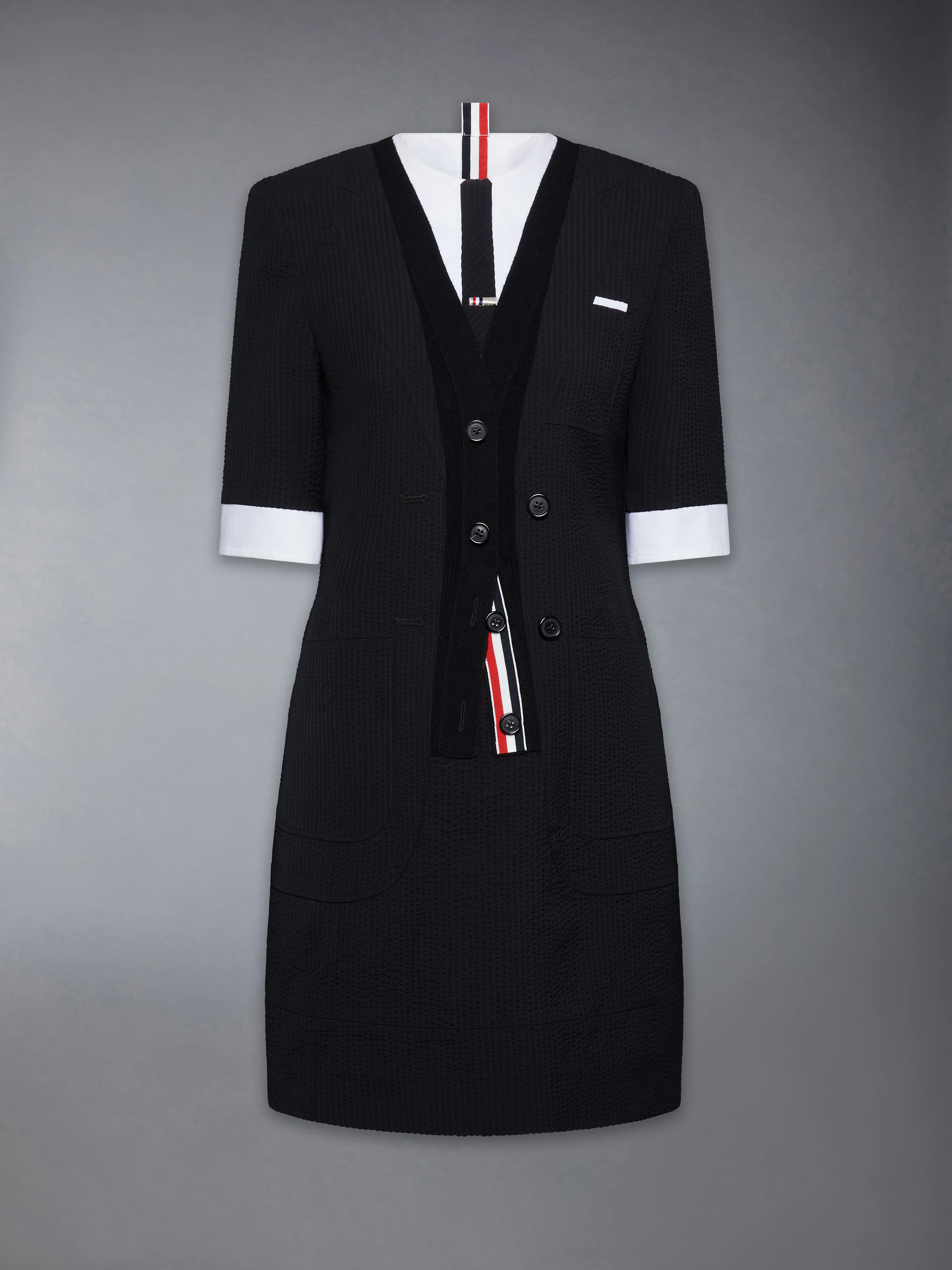 Uniform silhouettes are transformed into illusion through Thom Browne’s signature use of trompe l’œil—depicting a cardigan, shirt, and jacket through knit overlays, embroidery, and contrast trims. Cut in lightweight wool seersucker, this mini dress reimagines familiar forms with subversive charm and precision. Ground the look with a classic loafer. Back hidden zip closure with RWB-detailed pull Tricolor silk twill lining Trompe l'œil layered cardigan and sack jacket with embroidered tie bar Signature striped grosgrain loop tab Model is 5'10" (178 cm), wearing size 40 100% Wool Combo 1: 100% Cotton Combo 2: 100% Cashmere Combo 3: 100% Cashmere Lining: 100% Silk Made in Italy FDSF33E-06455-001