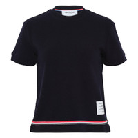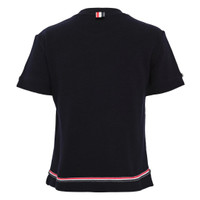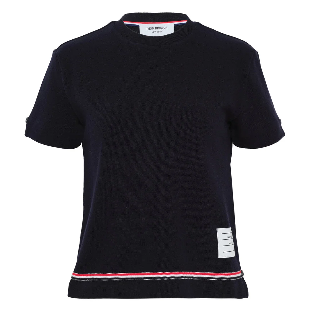600077506NVY036 / FJS193A-J0185/00/415 - Notch collar construction - Short sleeves with ribbed cuffs - Tricolor grosgrain trim at hem - Signature white label patch - Premium cotton knit fabric - Tailored fit The Thom Browne Short Sleeve Notch Tee delivers sophisticated luxury with the brand's signature preppy aesthetic. Crafted from premium cotton knit in classic navy, featuring the iconic tricolor grosgrain trim at the hem and signature white label patch. The refined notch collar construction and tailored fit embody Thom Browne's distinctive American craftsmanship.