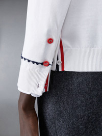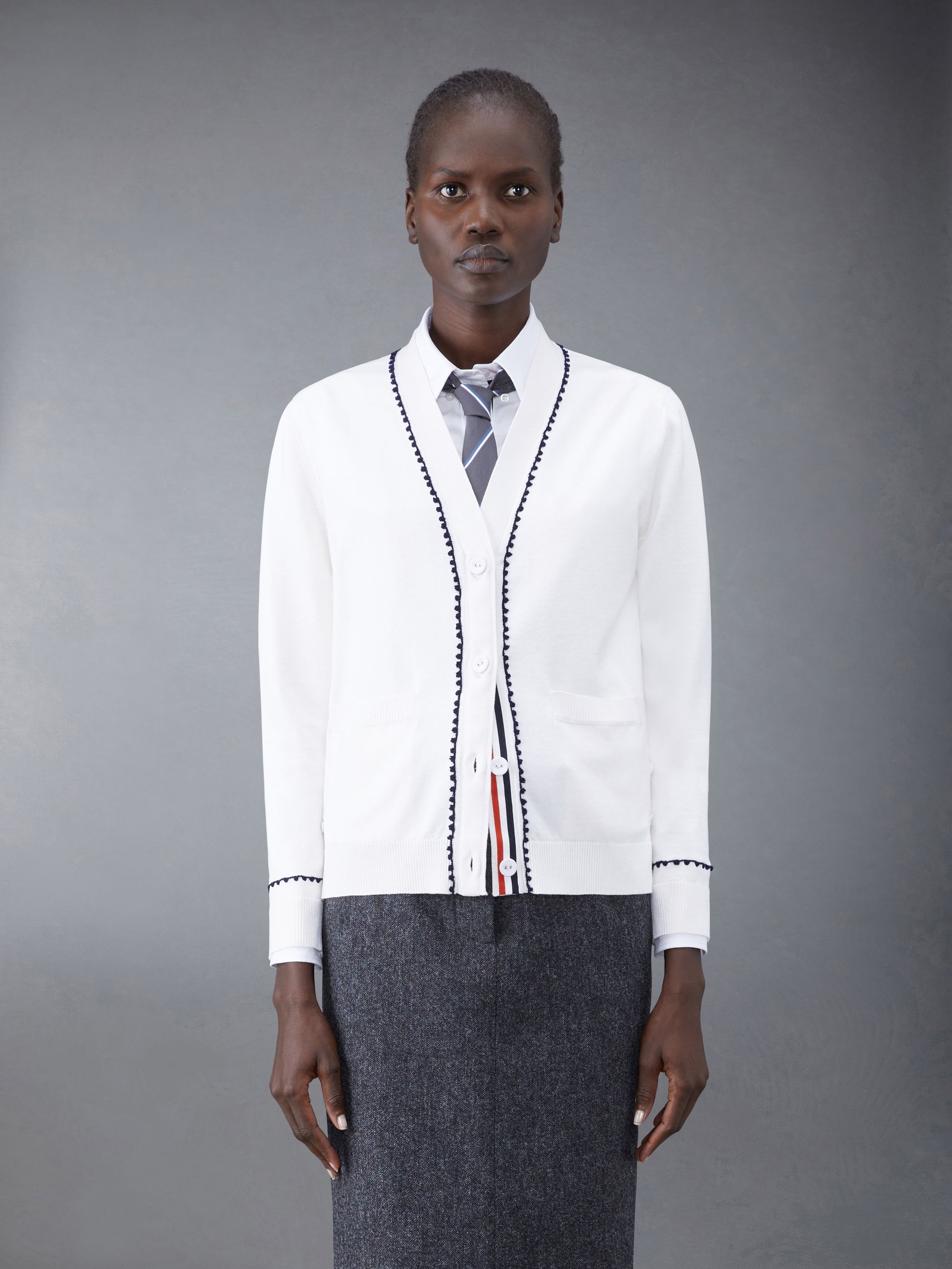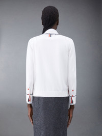 DETAILS & FIT V-neck cardigan in white silk cotton jersey with embroidered details through placket and cuffs. Front button closure with striped grosgrain placket, 2 slip front pockets, ribbed cuffs and hem. Buttoned side vents and cuffs with signature striped grosgrain trim. Signature striped grosgrain loop tab at back of neck. Model is 5'10" (178 cm), wearing size 40 55% Silk, 45% Cotton Made in Italy FKC531EY4501100