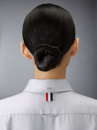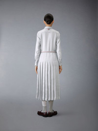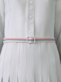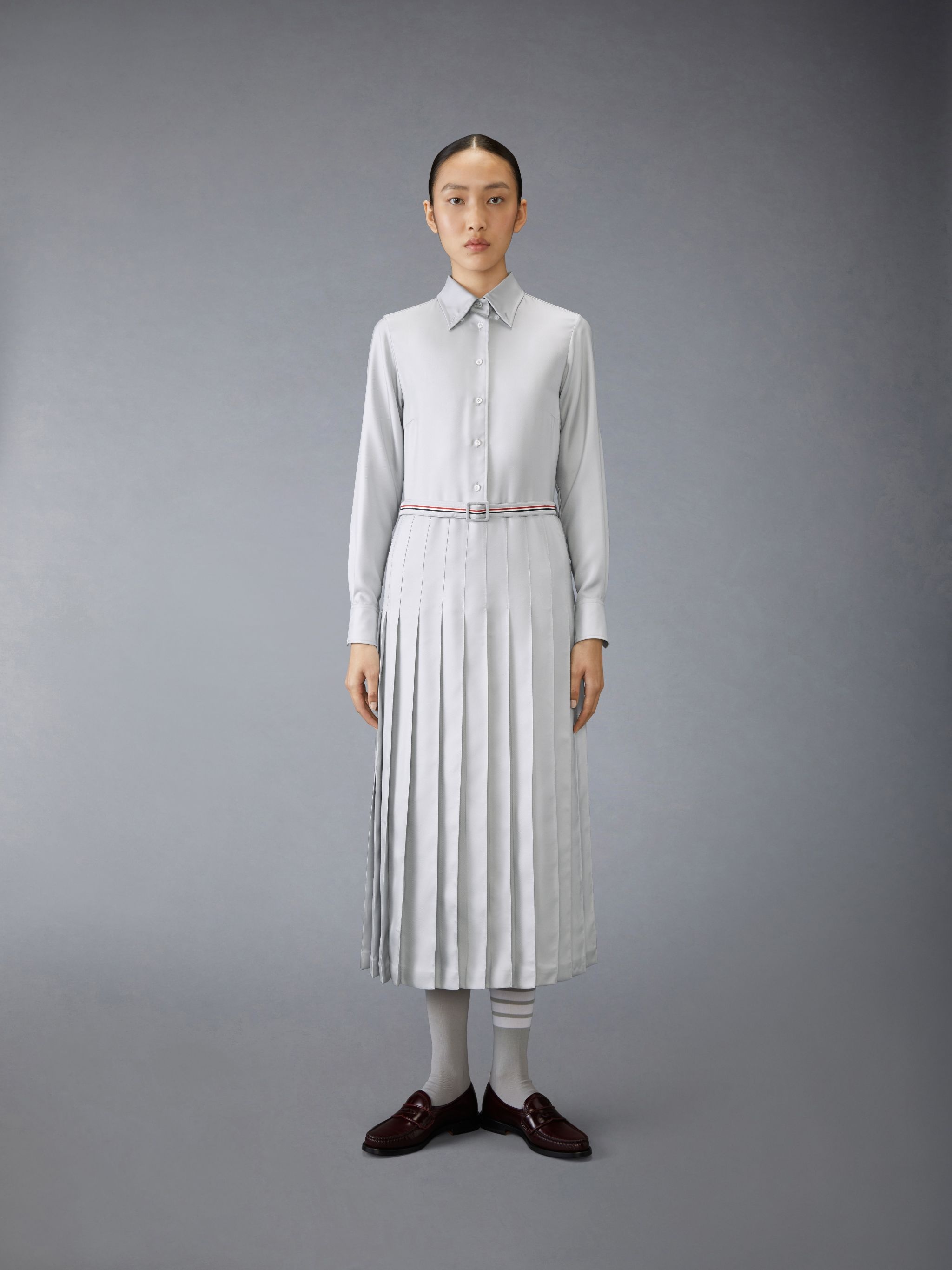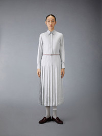 DETAILS & FIT Our classic shirtdress, accessorized with a signature Thom Browne belt and iconic grosgrain trim. Pair it with any of our leather brogues. Front button closure Belted waist Pleated back yoke with locker loop Signature striped grosgrain loop tab Model is 5'10" (178 cm), wearing size 40 100% Silk Lining: 100% Cupro Made in Italy FDSF01A-F0780-055