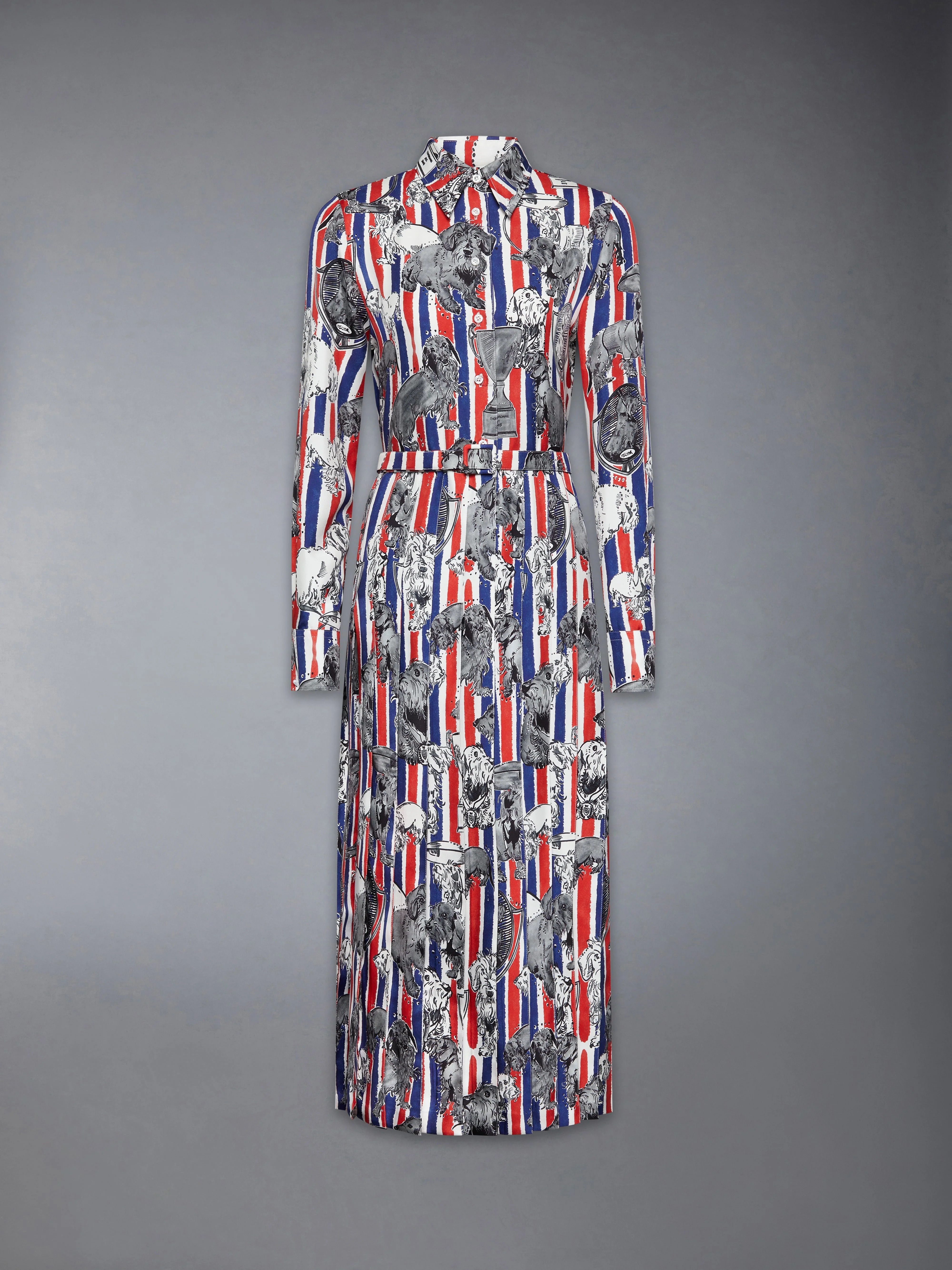 Crafted in silk twill, this calf-length dress features a seasonal print that celebrates ten years of Hector as a Thom Browne icon in a bold arrangement of illustrated accolades and portraits of the beloved dachshund. Layered over tricolor stripes, the pattern blends playful scale with a spirit of pageantry and pride on a silhouette that balances refinement and storytelling. Front button and side zip closures Button-down point collar Pleated back yoke with locker loop Self belt Pleated skirt Signature striped grosgrain loop tab Calf length Model is 5'10" (178 cm), wearing size 40 100% Silk Made in Italy FDSF01A-F1122-960