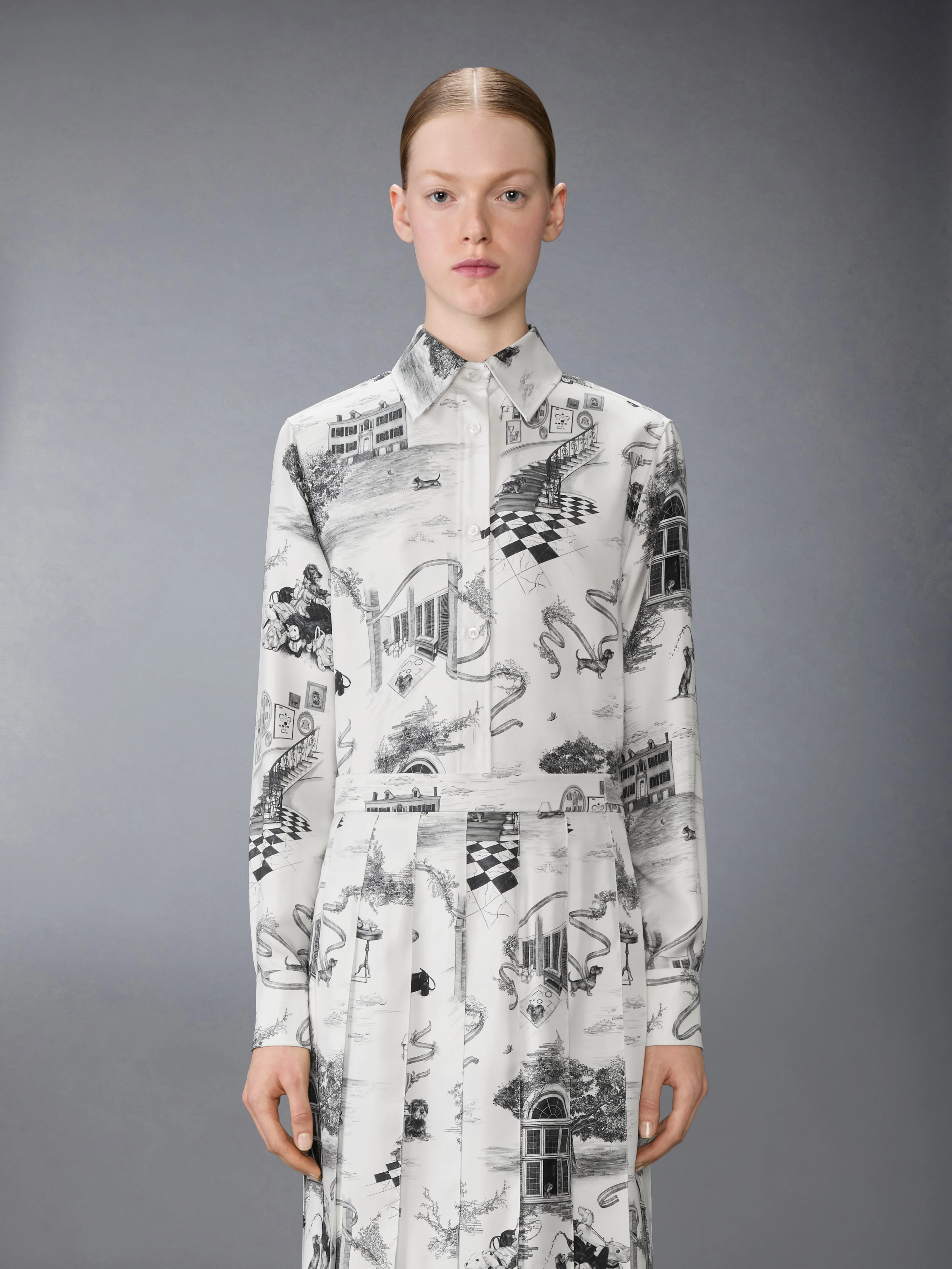 In celebration of Hector’s tenth year as an icon, this silk twill shirt features a highly personal tableau that is part portrait, part pastoral dream. Illustrated vignettes depict the beloved dachshund across a landscape drawn from Thom Browne’s own upstate world, merging storytelling and craft in equal measure. Style with the matching pleated skirt for a complete expression of the narrative. Front button closure Pleated back yoke with locker loop Buttoned cuffs Rounded hem Name tag applique Signature striped grosgrain loop tab Model is 5'10"" (178 cm), wearing size 40 100% Silk Made in Italy FLL215A-F1134-980