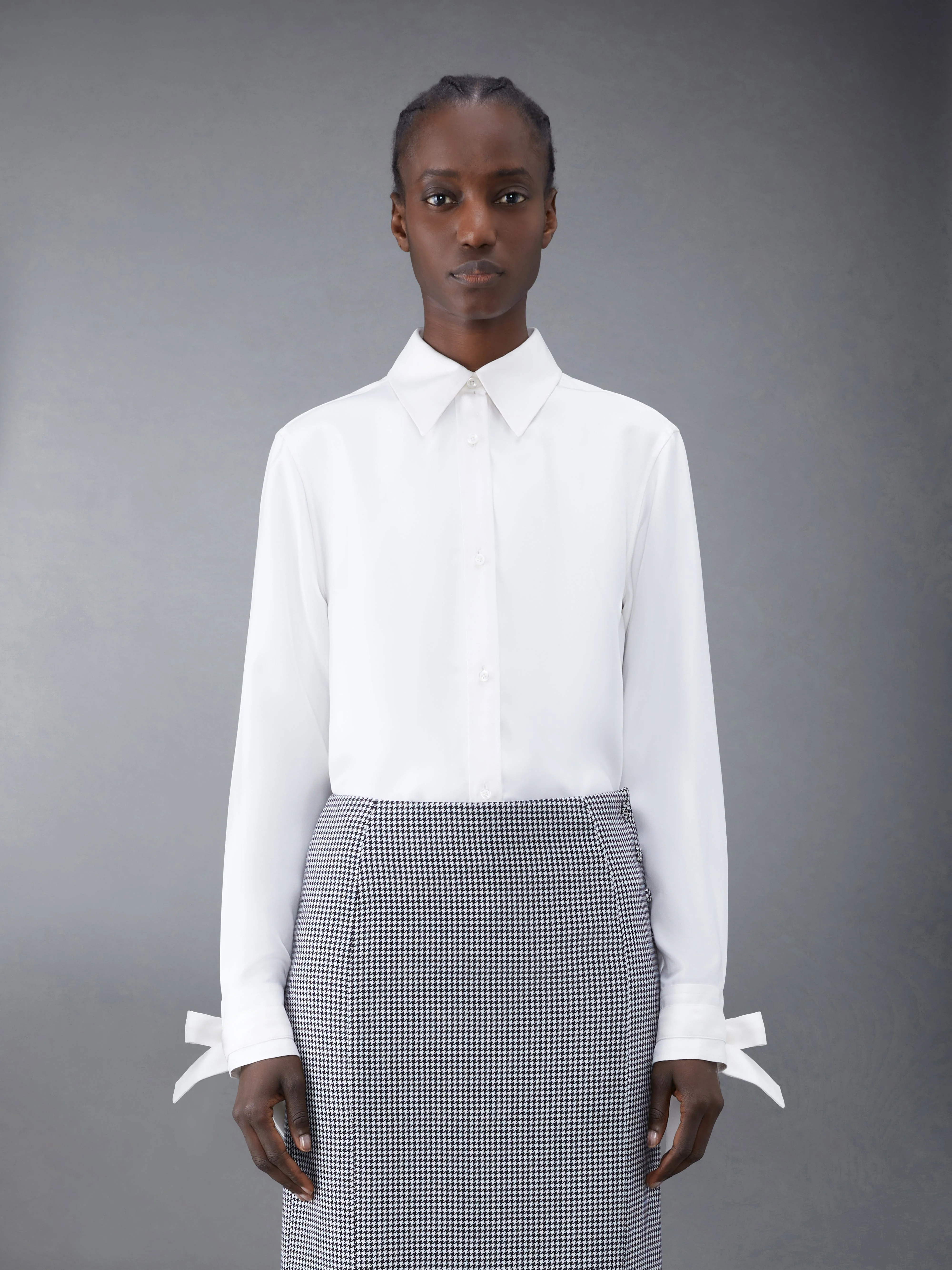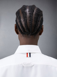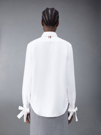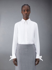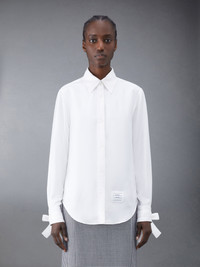 Easy fit shirt in white silk twill with scarf details at cuffs. Front button closure, point collar, name tag applique at shirttail hem. Pleated back yoke with locker loop. Signature striped grosgrain loop tab at back of neck. Model is 5'10" (178 cm), wearing size 40 100% Silk Made in Italy FLL156A-07283-100