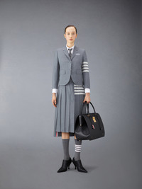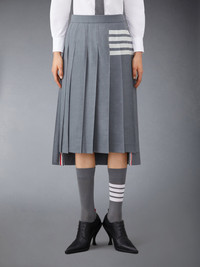 Inspired by East Coast preppy icons but reimagined with inventive proportions and quality craftsmanship, our Plain Weave 4-Bar Below Knee Dropped Back Pleated Skirt is a fresh take on a traditional silhouette. Pair with our leather brogue heels. Engineered 4-bar stripe detail Dropped back hem with signature striped grosgrain trim Adjustable Buttoned side tab closure Signature striped grosgrain loop tab at back waist Model is 5' 10" (178cm), wearing size 40 100% Wool Lining: 100% Cupro Made in Italy FGC400V-06146-035