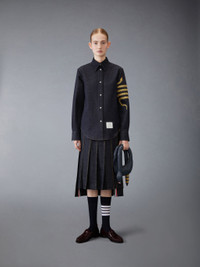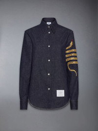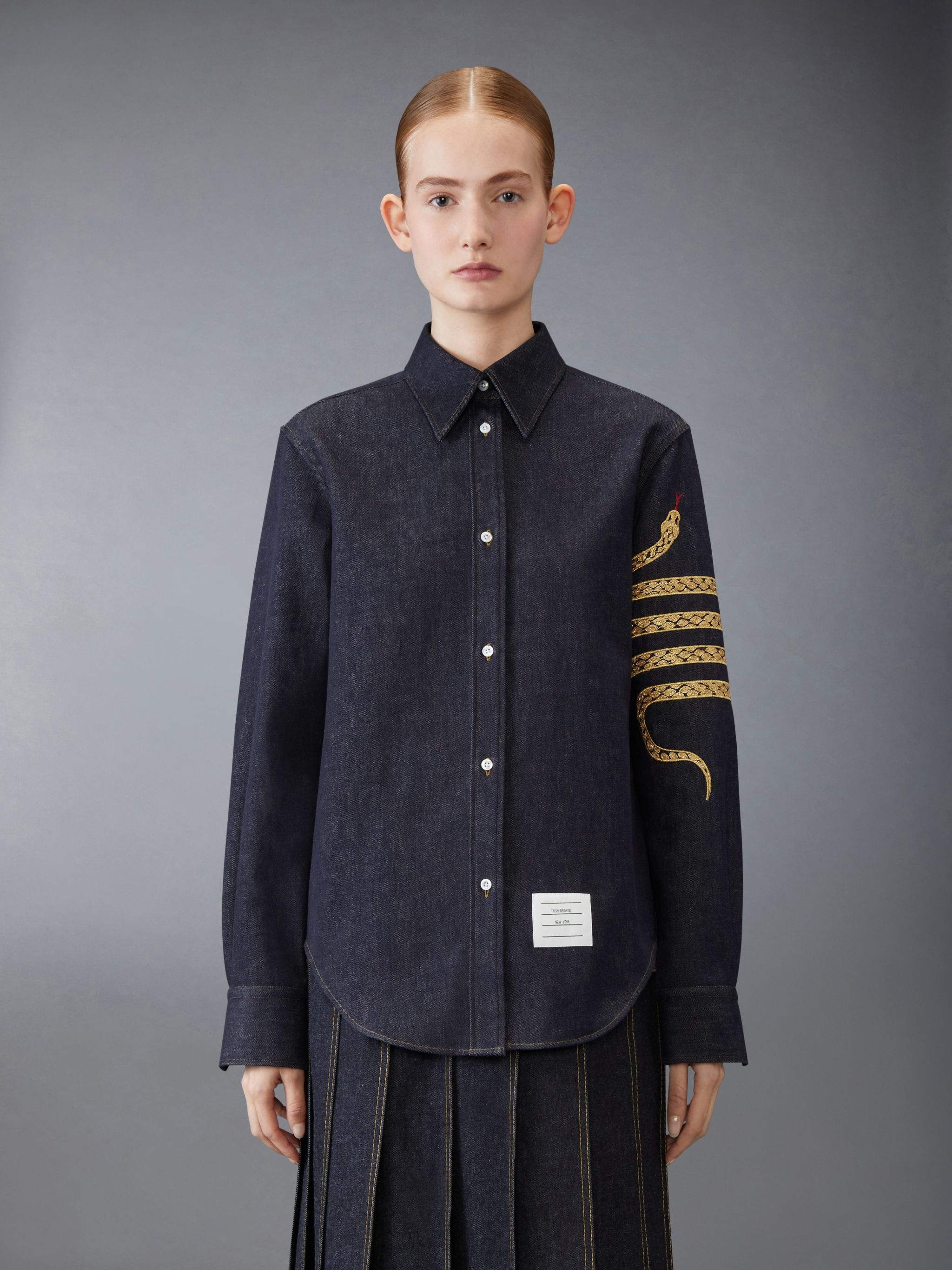 DETAILS & FIT To the Year of the Snake. Tradition meets artistry with this exquisite button down, adorned with a majestic, intricately embroidered golden snake that envelops you in wisdom, grace, and prosperity. Finished with elegant golden contrast trim, this piece embodies refined elegance. Ring in the New Year with style and sophistication. Made with an easy fit for effortless wear. Complete the look with our Lunar New Year Denim Trouser. Front button closure Name tag applique Pleated back yoke with locker loop Signature striped grosgrain loop tab Model is 5'10" (178 cm), wearing size 40 100% Cotton Combo 1: 35% Polyamide, 25% Paper, 20% Metal, 20% Polyester Combo 2: 45% Rayon, 20% Polyester, 20% Metal, 15% Paper Made in Italy FLL162E-E1186-450