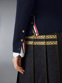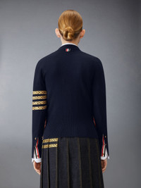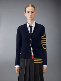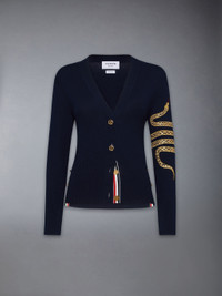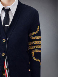 DETAILS & FIT To the Year of the Snake. Tradition meets artistry with this exquisite cardigan, adorned with a majestic, intricately embroidered golden snake that envelops you in wisdom, grace, and prosperity. Ring in the New Year with style and sophistication. Our Lunar New Year Wool 4-Bar V Neck Cardigan is made from rich merino wool for ultimate comfort. Complete the look with our Lunar New Year Denim Pleated Skirt. Front button closure with striped grosgrain placket Buttoned side vents with signature striped grosgrain trim Buttoned cuffs with signature striped grosgrain trim Signature striped grosgrain loop tab Model is 5'10" (178 cm), wearing size 40 98% Virgin Wool, 2%Polyamide Combo 1: 45% Rayon, 20% Polyester, 20% Metal, 15% Paper Combo 2: 35% Polyamide, 25% Paper, 20% Metal, 20% Polyester Made in Italy FKC620E-Y1051-415
