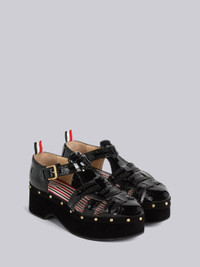 DETAILS & FIT Fisherman clog sandal in soft black patent leather with suede-covered platform sole. Brass buckle closure at ankle strap. Broguing details and pinked edges throughout. Brass rivets through welt. Striped insole. Signature striped grosgrain loop tab at heels. Made in Italy Upper:100% Calf Patent Leather Sole:100% Wood FFF141C00216001