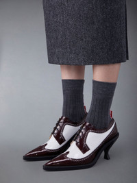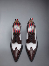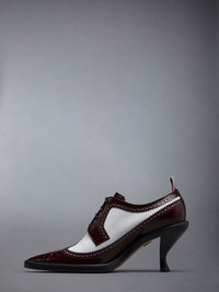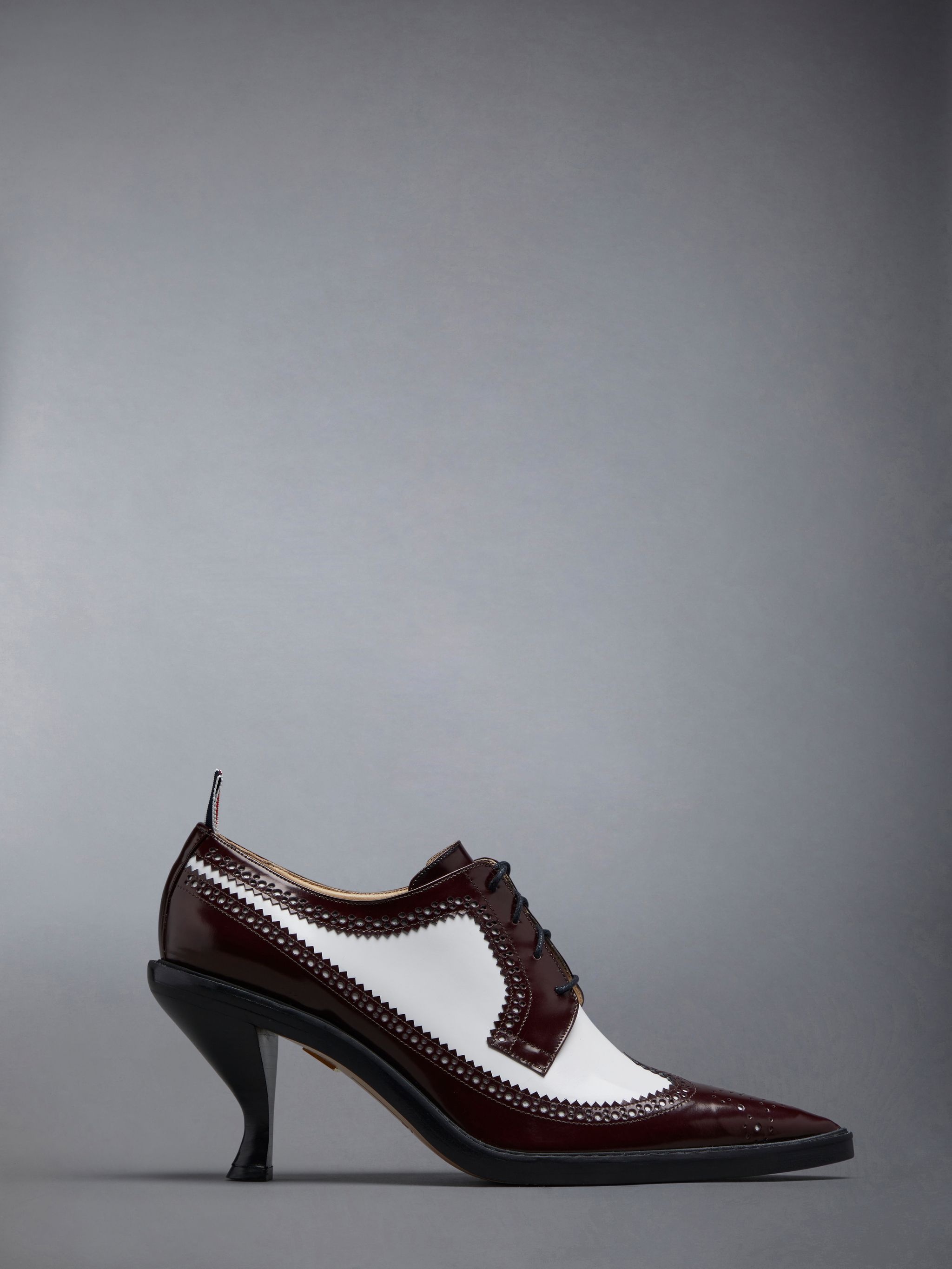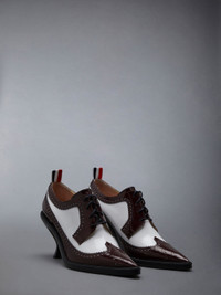DETAILS & FIT Longwing spectator brogue in soft white and cordovan spazzolato leather with 75mm curved heel. Thin lace up closure, pinked and brogued details throughout. Leather sole and heel with rubber heel cap. Leather lining, striped insole. Signature striped grosgrain loop tabs at heels. Upper: 100% Calf Leather Sole: 100% Calf Leather Lining: 100% Goat Leather Lining 2: 100% Calf Leather Made in Italy FFH223BL0043614 - HEEL: 9.0cm - Sole height: 1.0cm